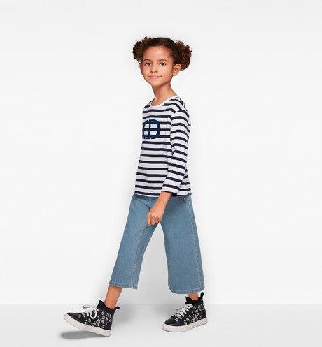 The long-sleeved T-shirt in navy blue and white striped cotton jersey is a stylish basic that can be worn through the seasons. The T-shirt is made from soft cotton jersey and features a velvety 'CD' signature printed on the front. Its relaxed silhouette is cut with a fluidity that allows it to be worn tucked or untucked, and a smaller version for babies is also available.