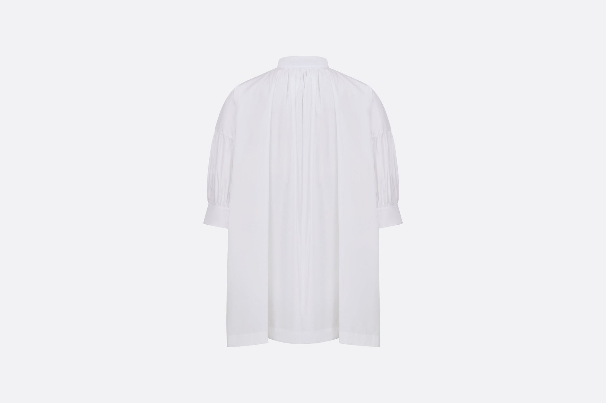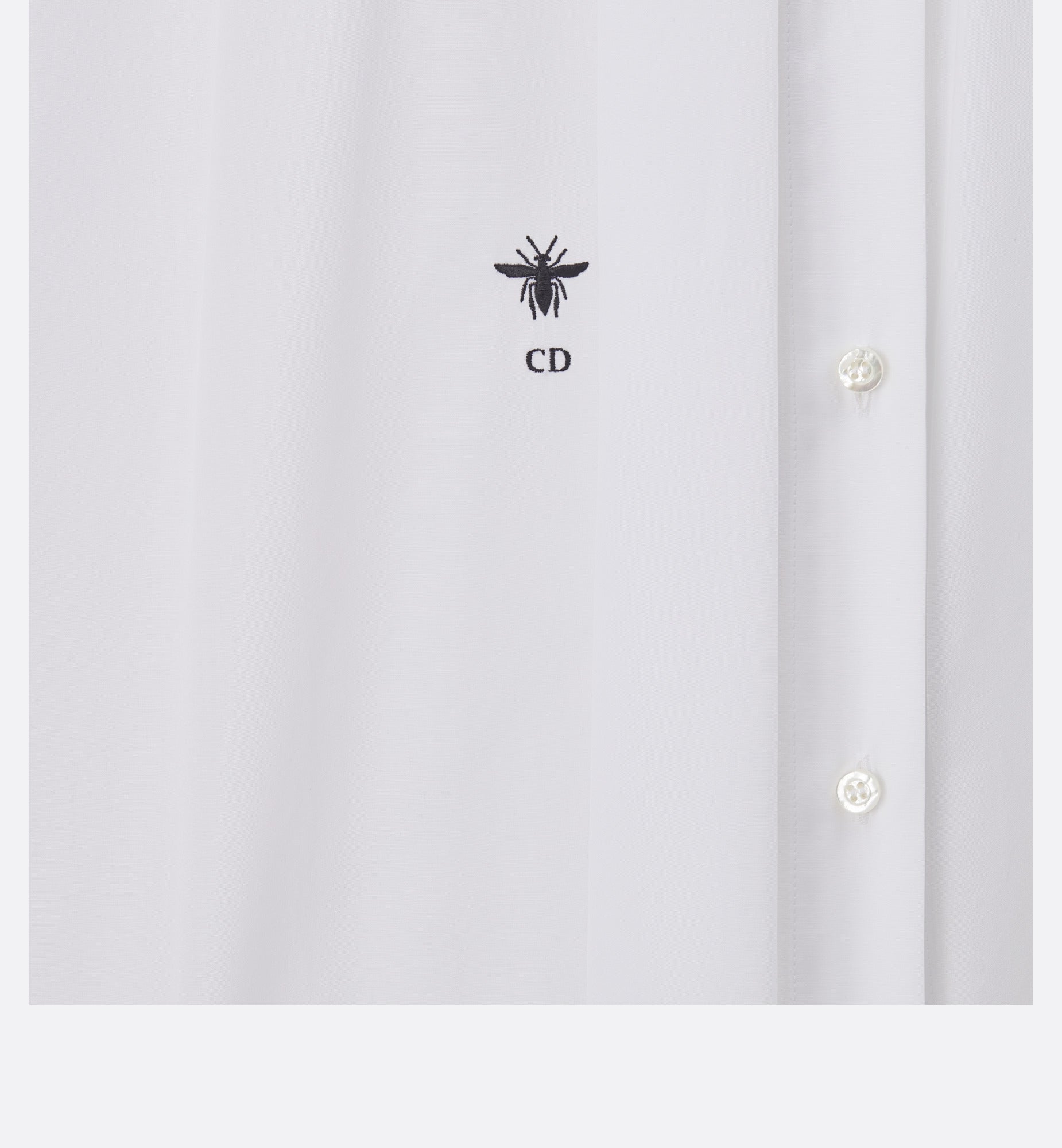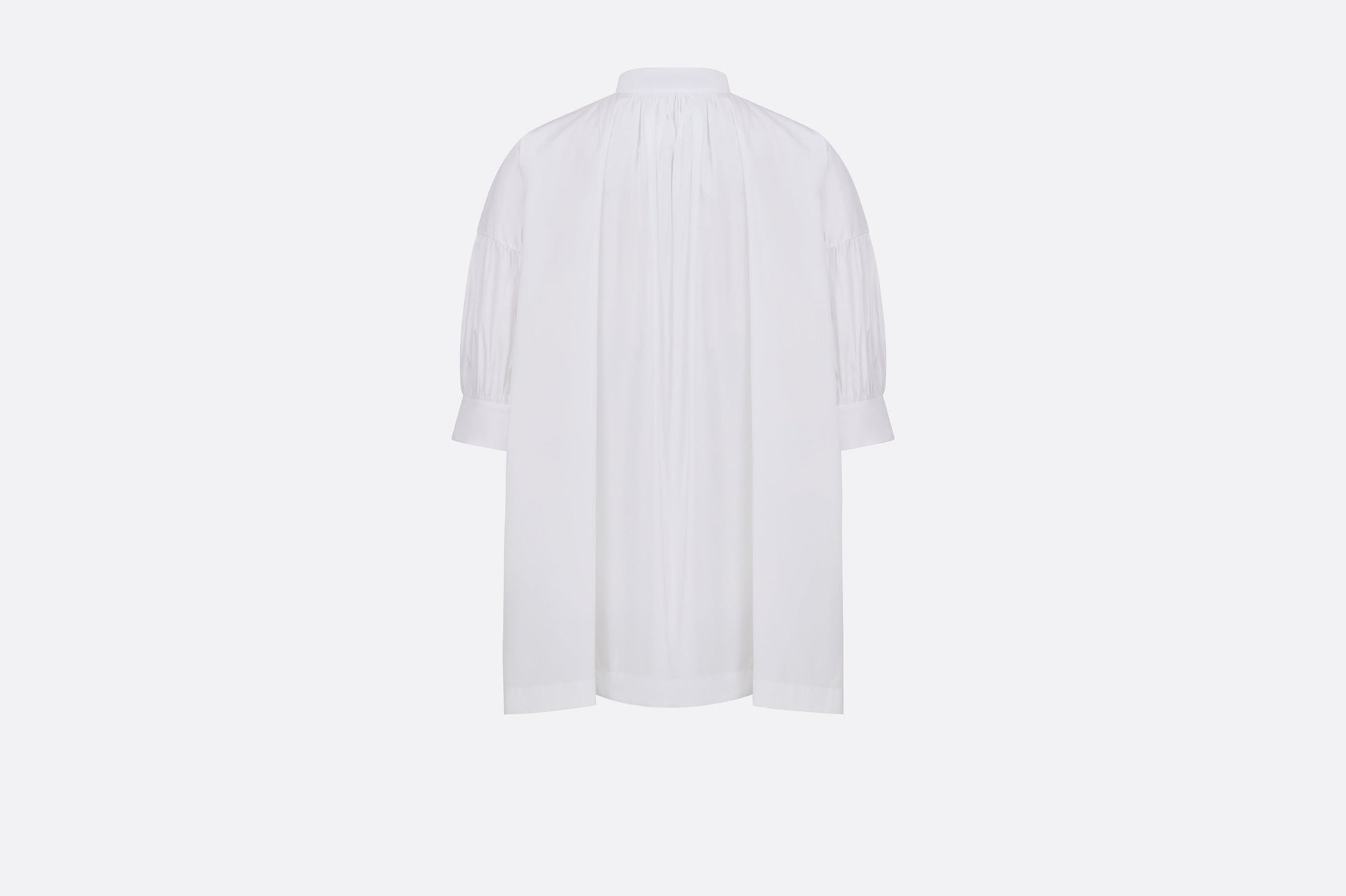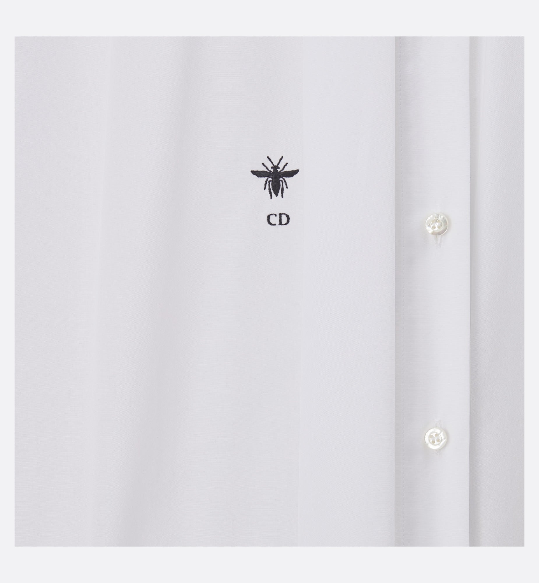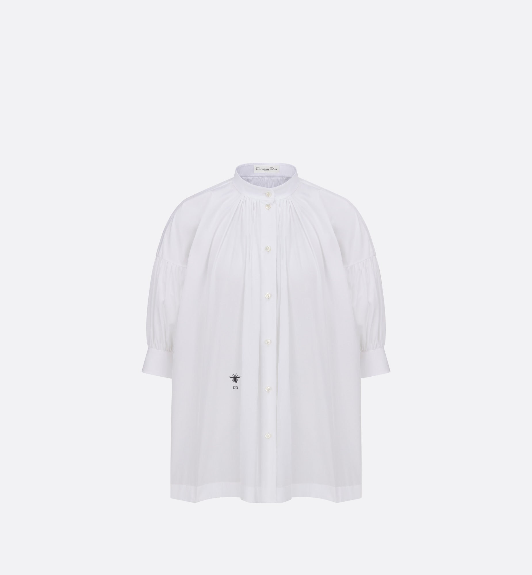 As revealed at the fashion show, the blouse, a hallmark Dior silhouette, is reframed in a romantic variation. Crafted in white cotton poplin, it features a loose fit that's distinguished by an officer collar, pleats and three-quarter puff sleeves. Completed by an embroidered bee, the long-sleeved blouse can be paired with pants or a skirt from the collection for elegant appeal.