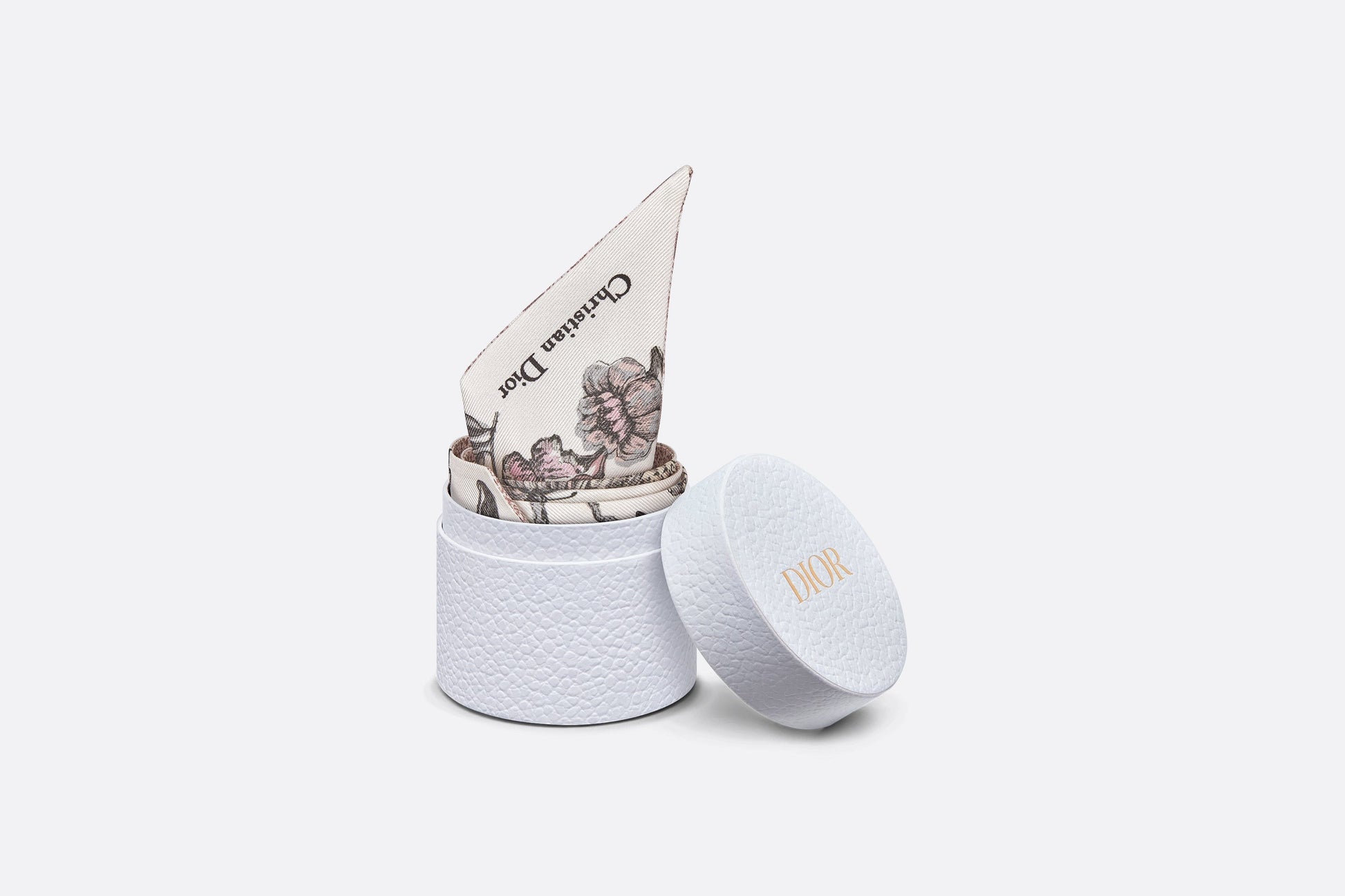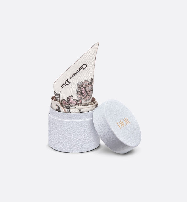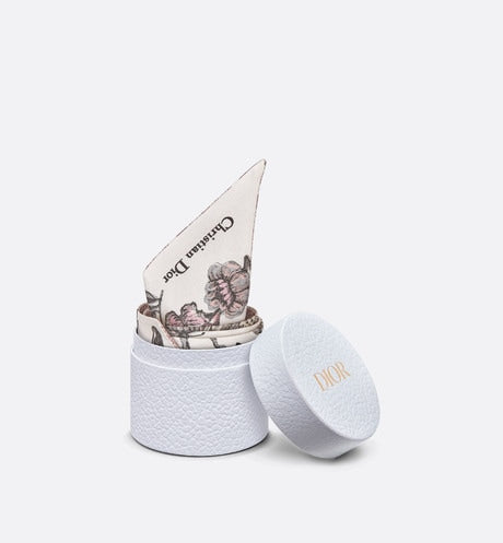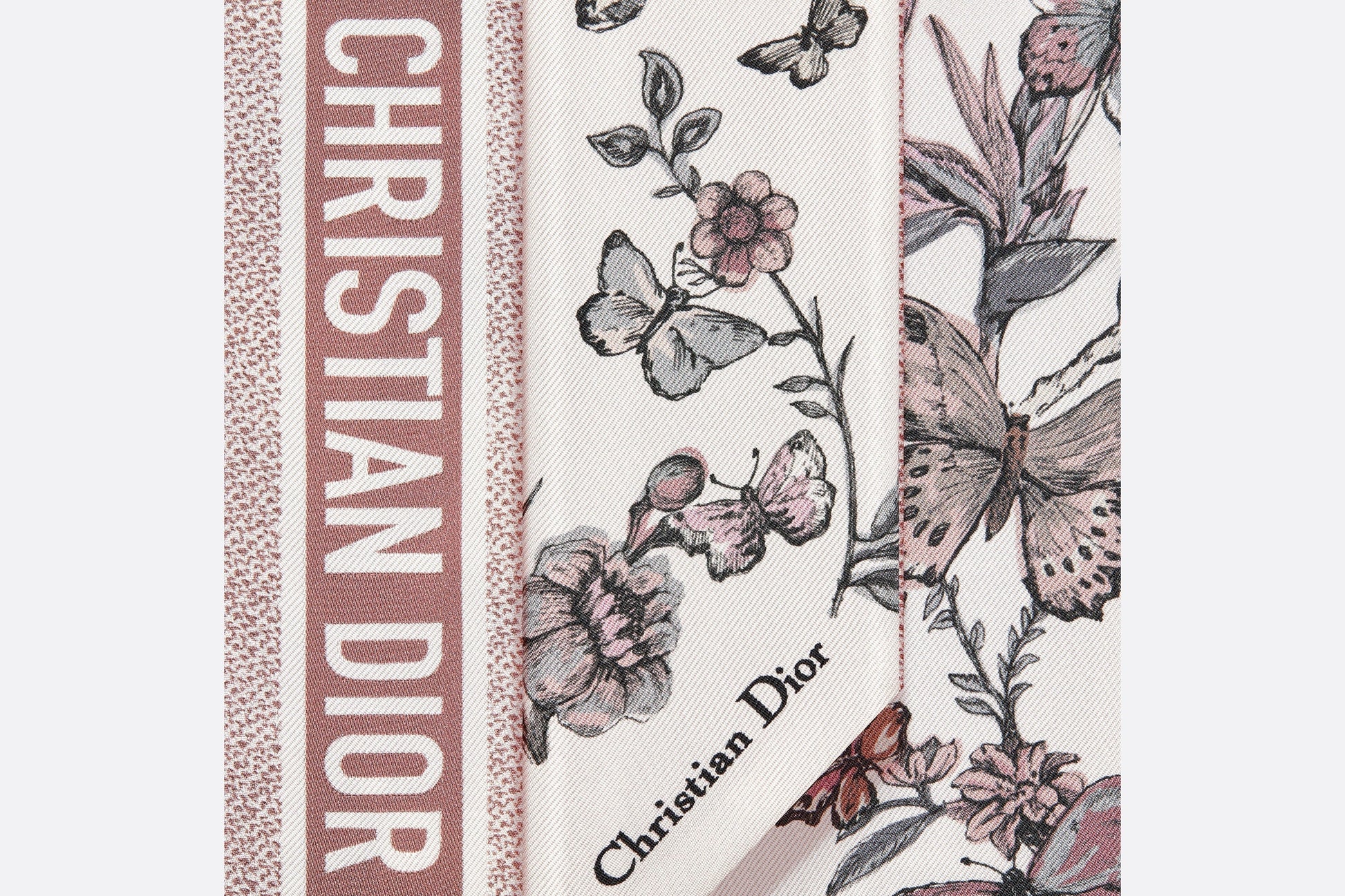 The Mitzah scarf features a white and pastel pink silk twill Toile de Jouy Mexico motif by Pietro Ruffo, showcasing butterflies and traditional Mexican flowers in a concert of colors. The timeless, elongated style with pointed ends is further embellished with a contrasting Christian Dior signature jacquard band on the back. The Mitzah scarf will lend the finishing touch to any modern look and may be tied around the neck, at the wrist or on a bag, and can be coordinated with other Toile de Jouy Mexico creations.