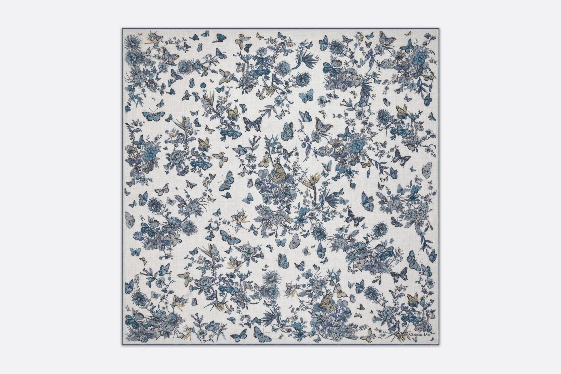 The shawl features a white and pastel midnight blue Toile de Jouy Mexico motif by Pietro Ruffo, showcasing butterflies and traditional Mexican flowers in a concert of colors. Crafted in cashmere, the design features hand-rolled edges and is enhanced by a Christian Dior signature. The soft and lightweight shawl can be worn tied around the neck or draped over the shoulders.