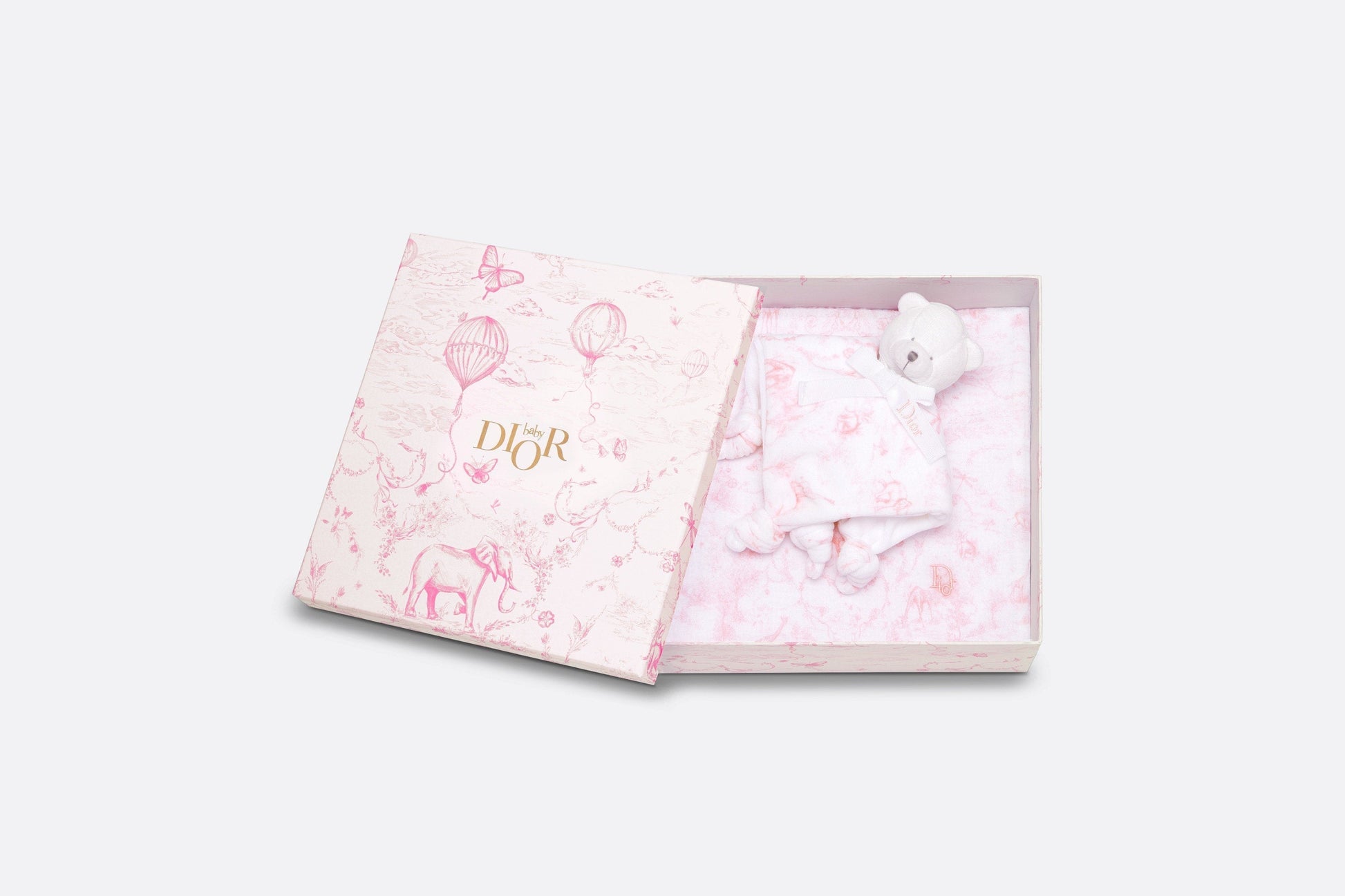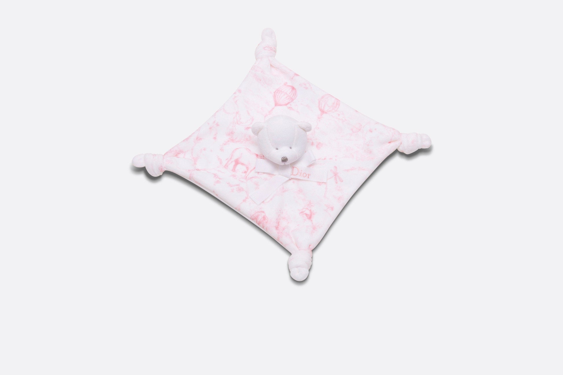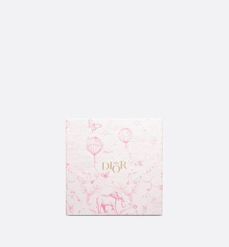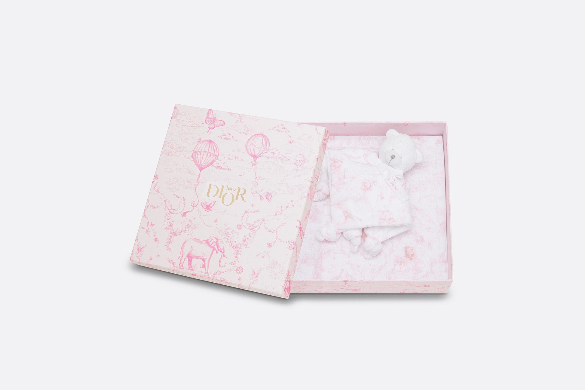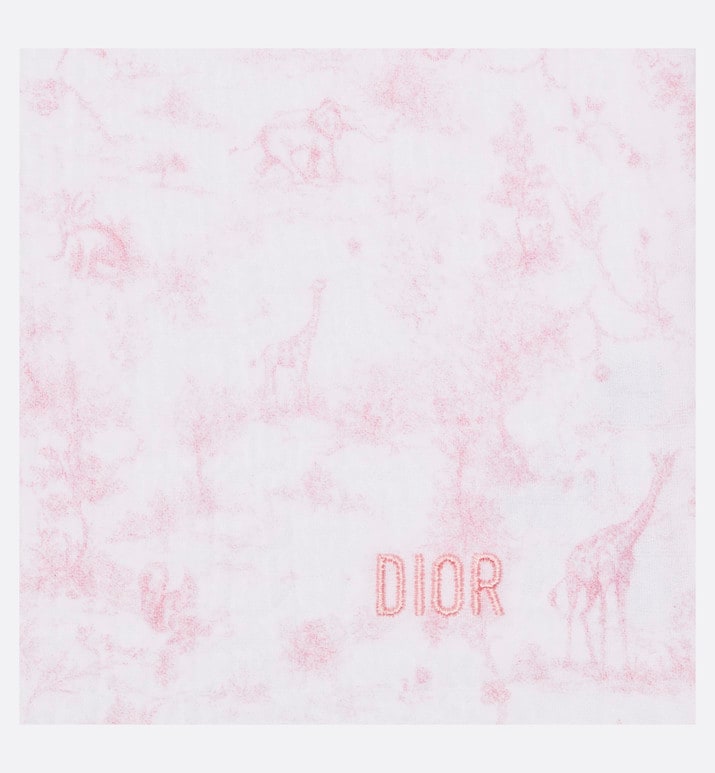 The newborn gift set includes a swaddle blanket and a stuffed toy embellished with a pale pink all-over Toile de Jouy print on the top. The swaddle blanket is crafted in a soft muslin and cotton interlock blend and is adorned with a tonal 'DIOR' embroidery, while the stuffed toy features a velvet teddy bear with a grosgrain ribbon. The timeless and delicate set is an ideal gift for newborns.