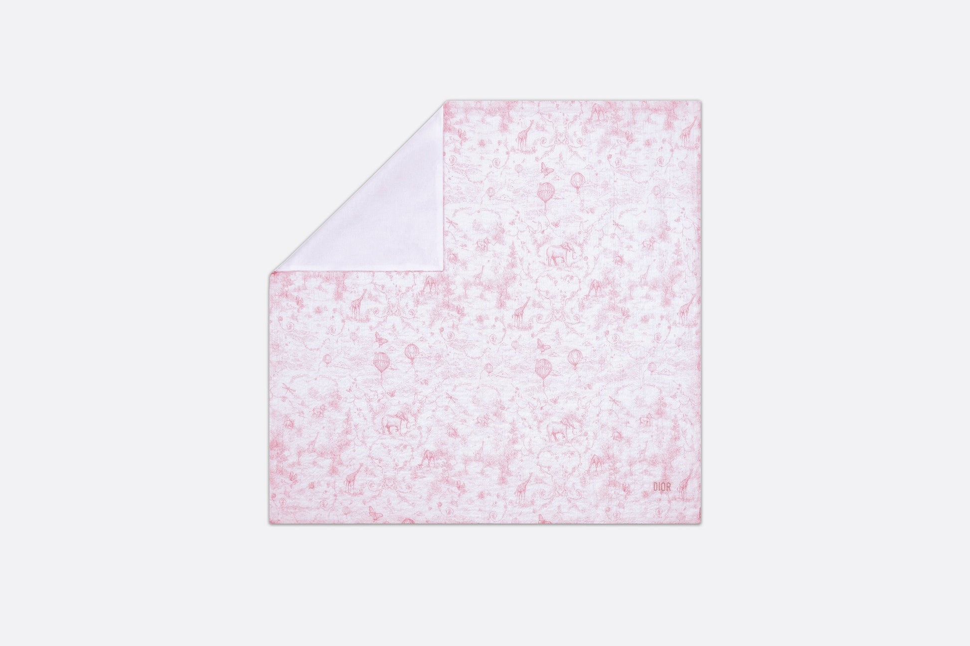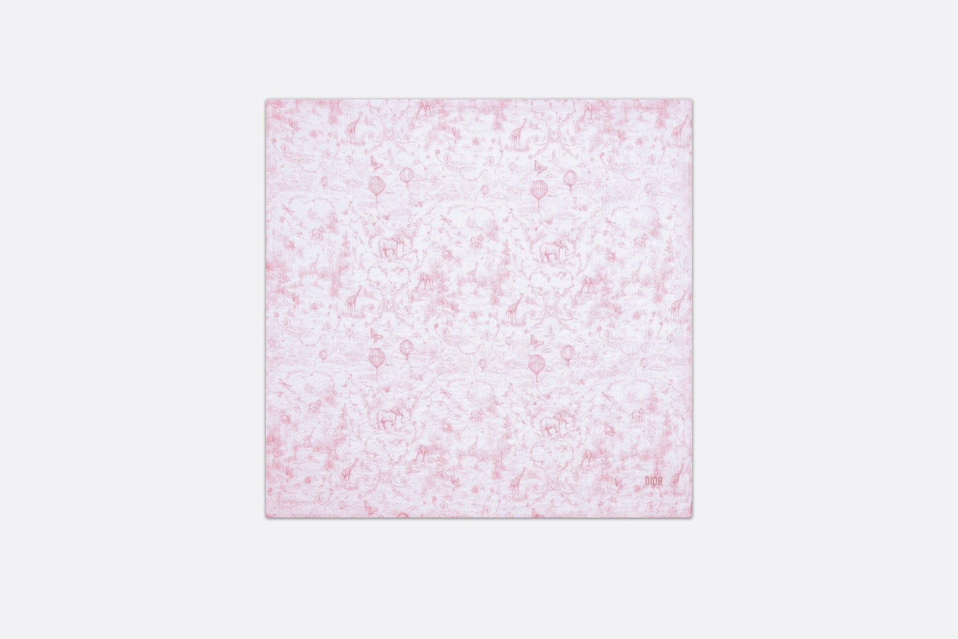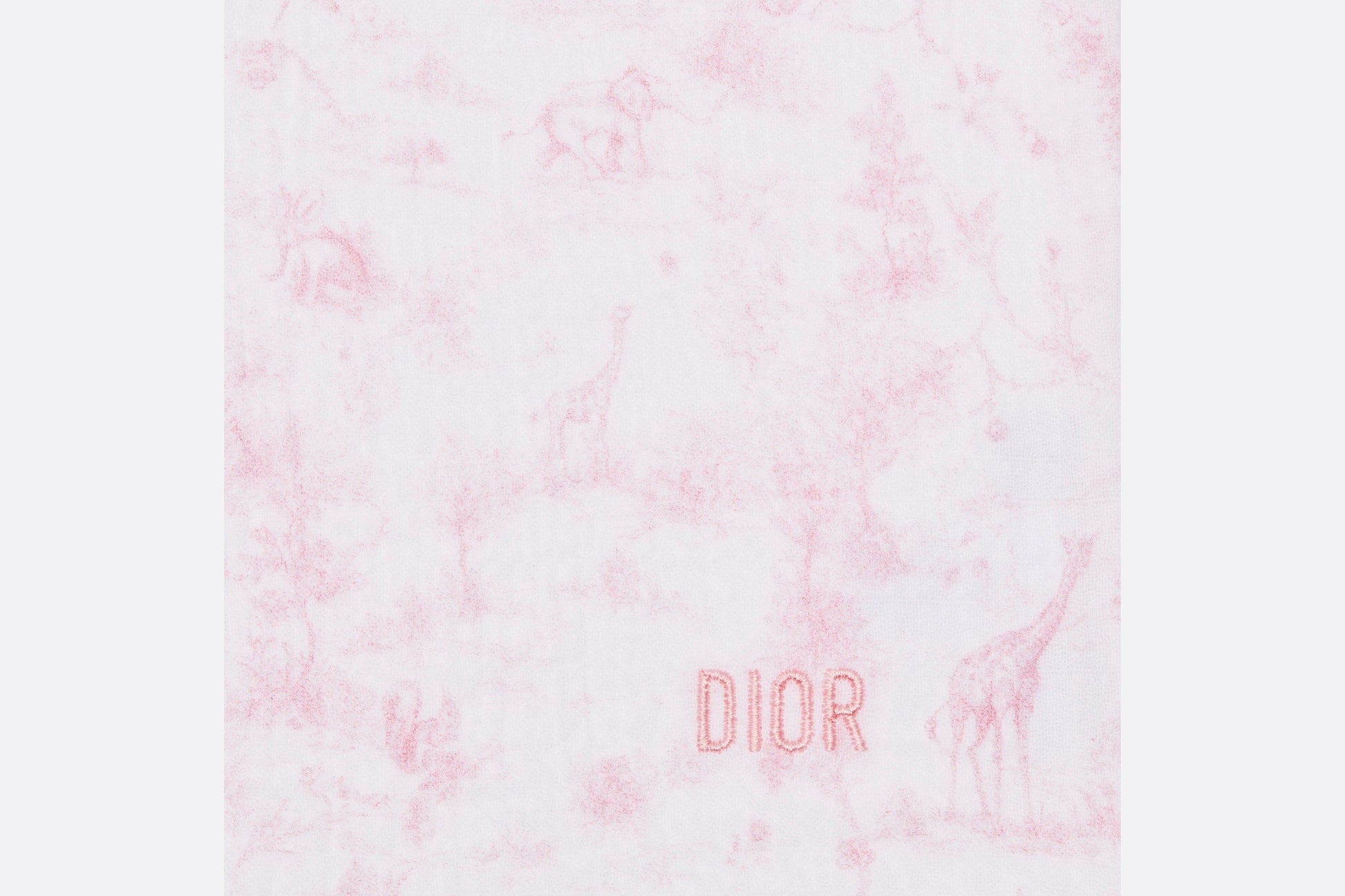 The newborn gift set includes a swaddle blanket and a stuffed toy embellished with a pale pink all-over Toile de Jouy print on the top. The swaddle blanket is crafted in a soft muslin and cotton interlock blend and is adorned with a tonal 'DIOR' embroidery, while the stuffed toy features a velvet teddy bear with a grosgrain ribbon. The timeless and delicate set is an ideal gift for newborns.