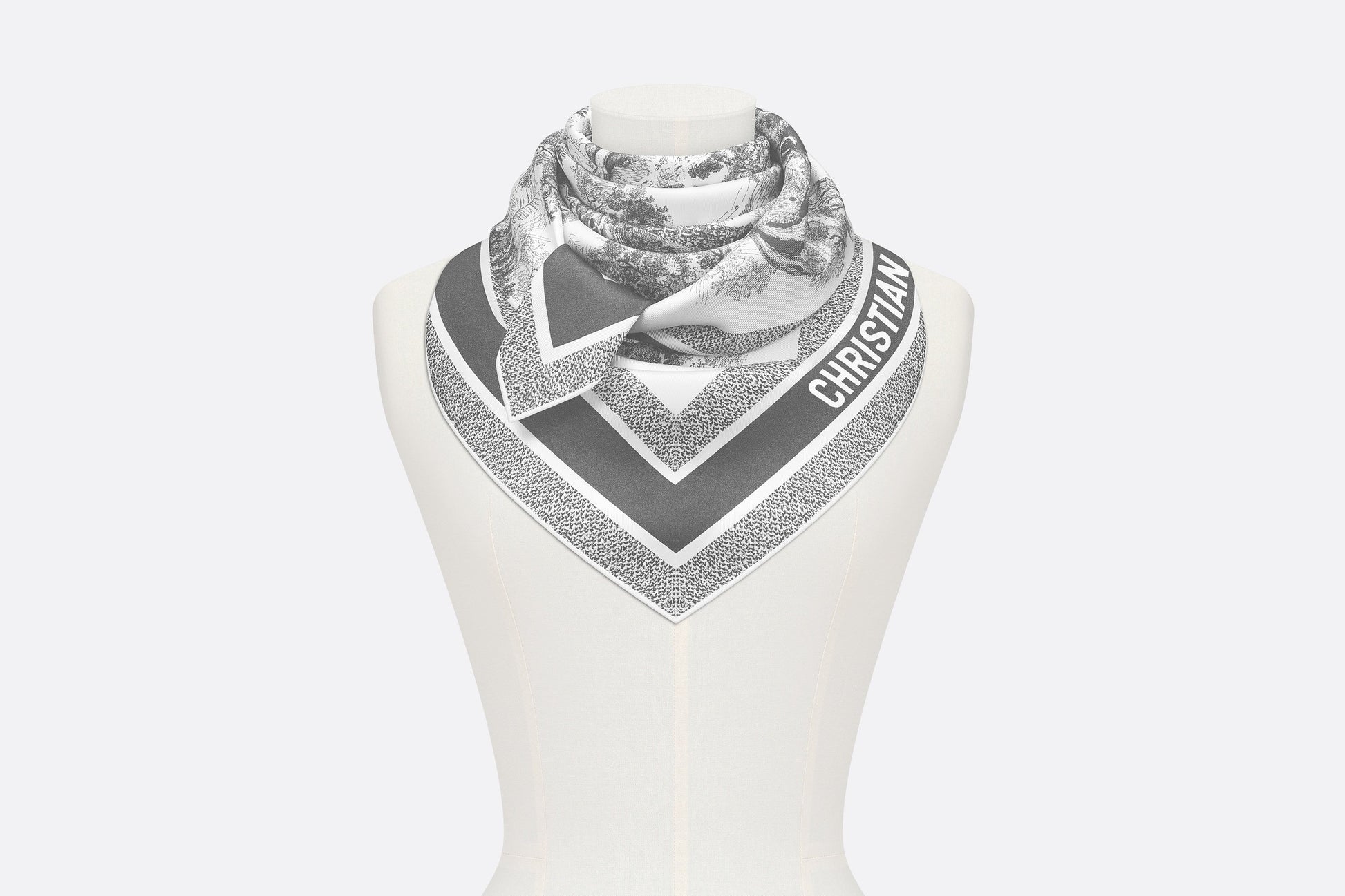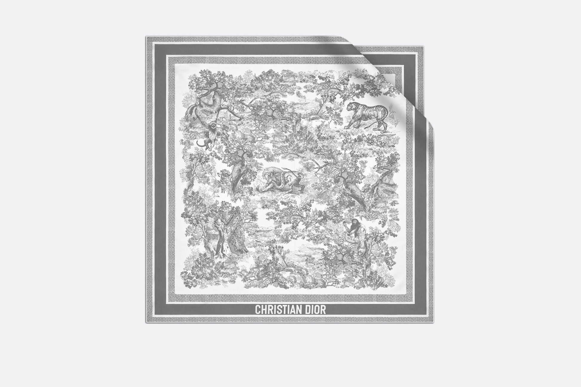 The Toile de Jouy Sauvage square scarf honors the hallmark House motif. Crafted in ivory and gray silk twill, the design has hand-rolled edges and is embellished with a contrasting 'CHRISTIAN DIOR' signature jacquard band. The scarf may be tied around the neck or head to complete a Dior look.