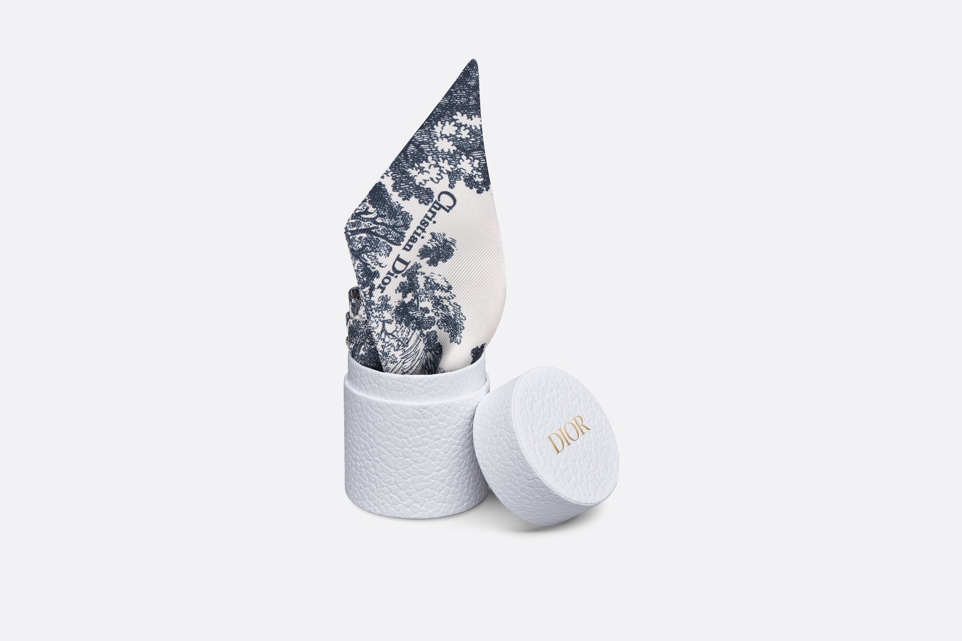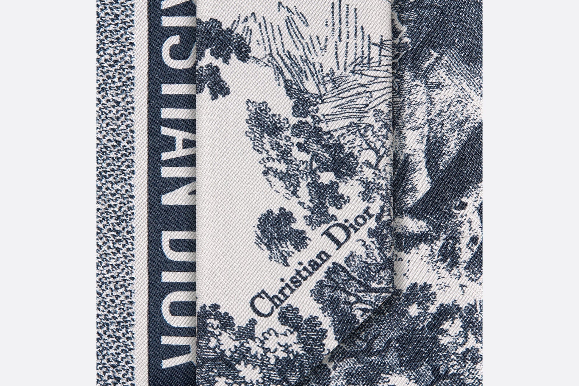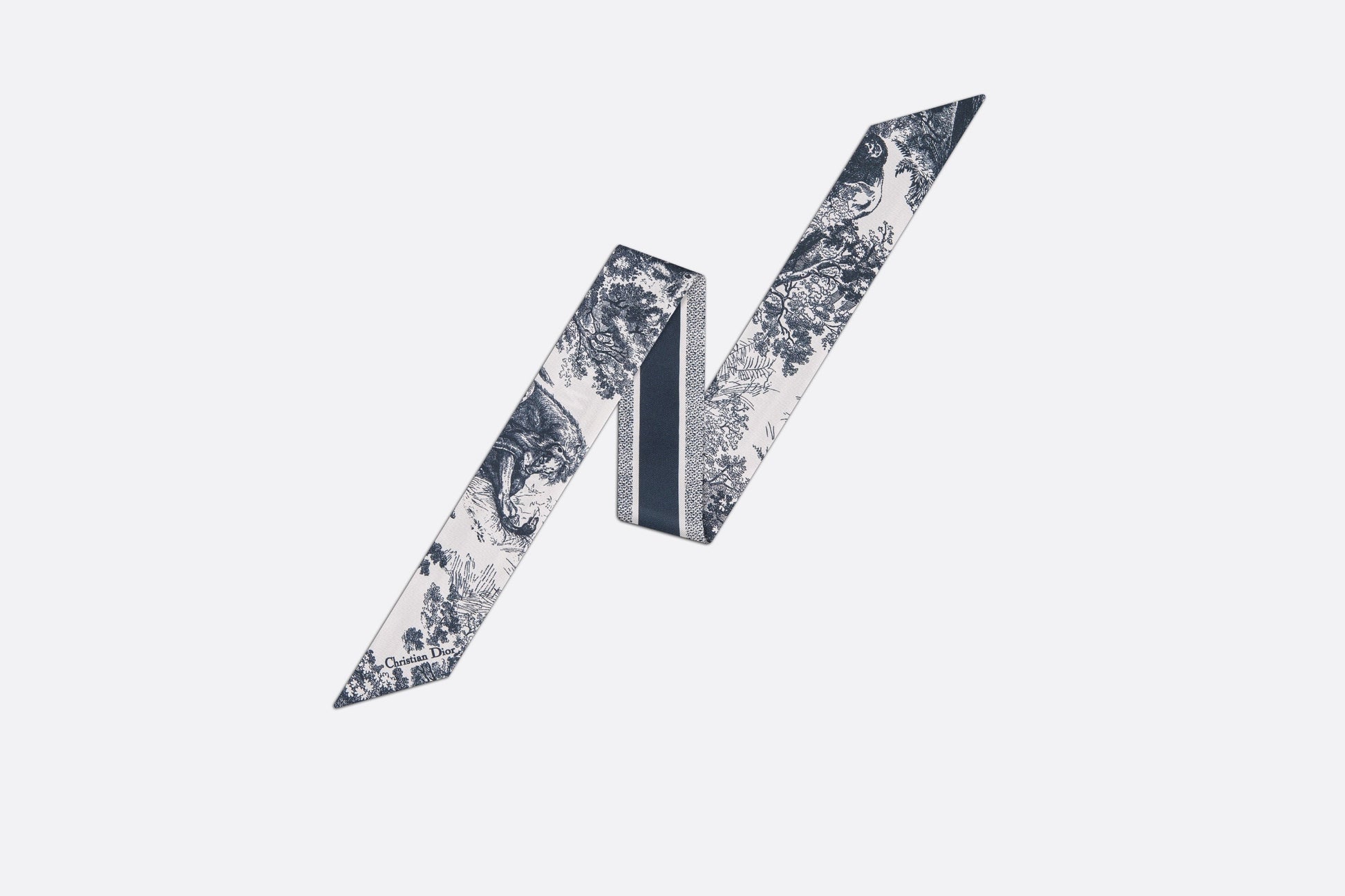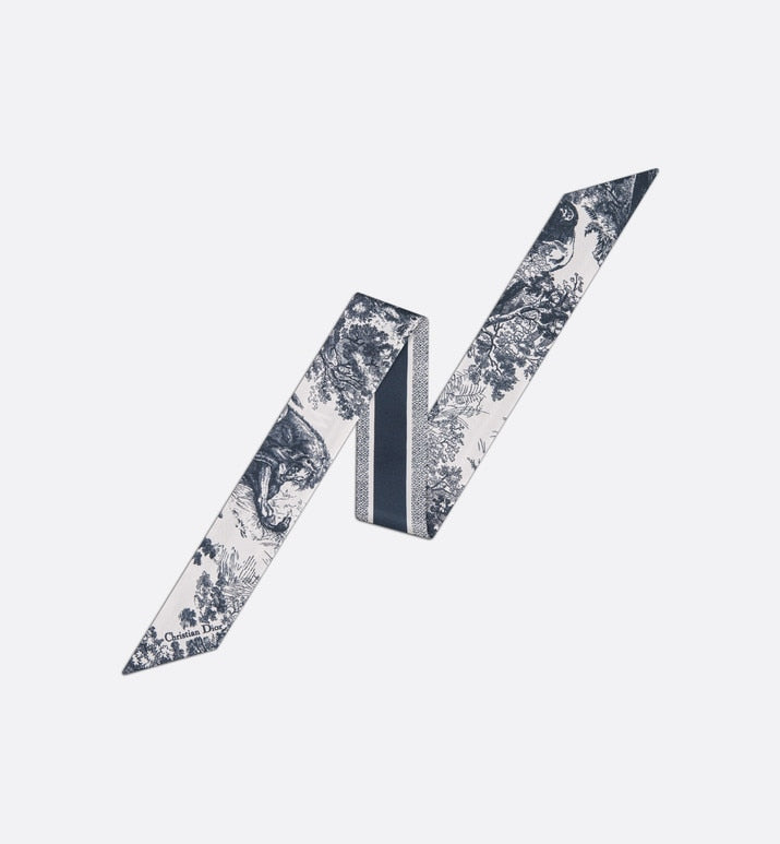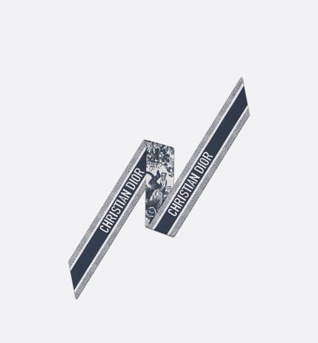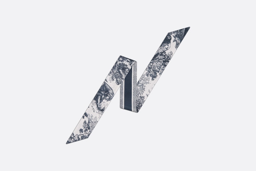 The Toile de Jouy Sauvage Mitzah scarf highlights the hallmark House motif. A timeless design, it is crafted in ivory and navy blue silk twill and is distinguished by an elongated shape with pointed ends. It is further embellished with a contrasting 'CHRISTIAN DIOR' signature jacquard band on the back. The Mitzah scarf will lend the finishing touch to any modern look and may be worn around the neck, tied at the wrist or on a bag.