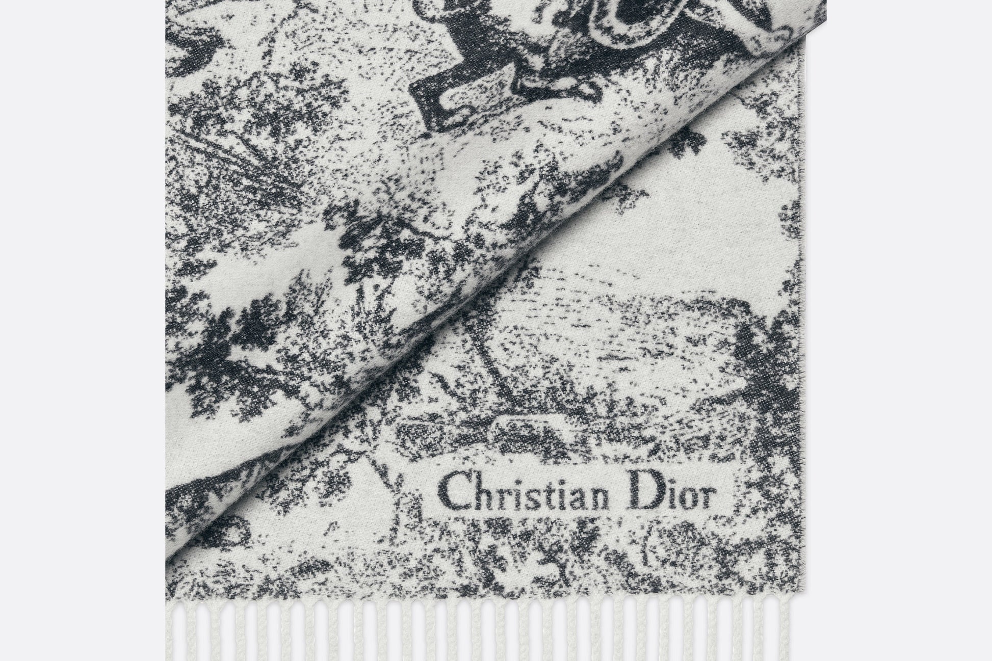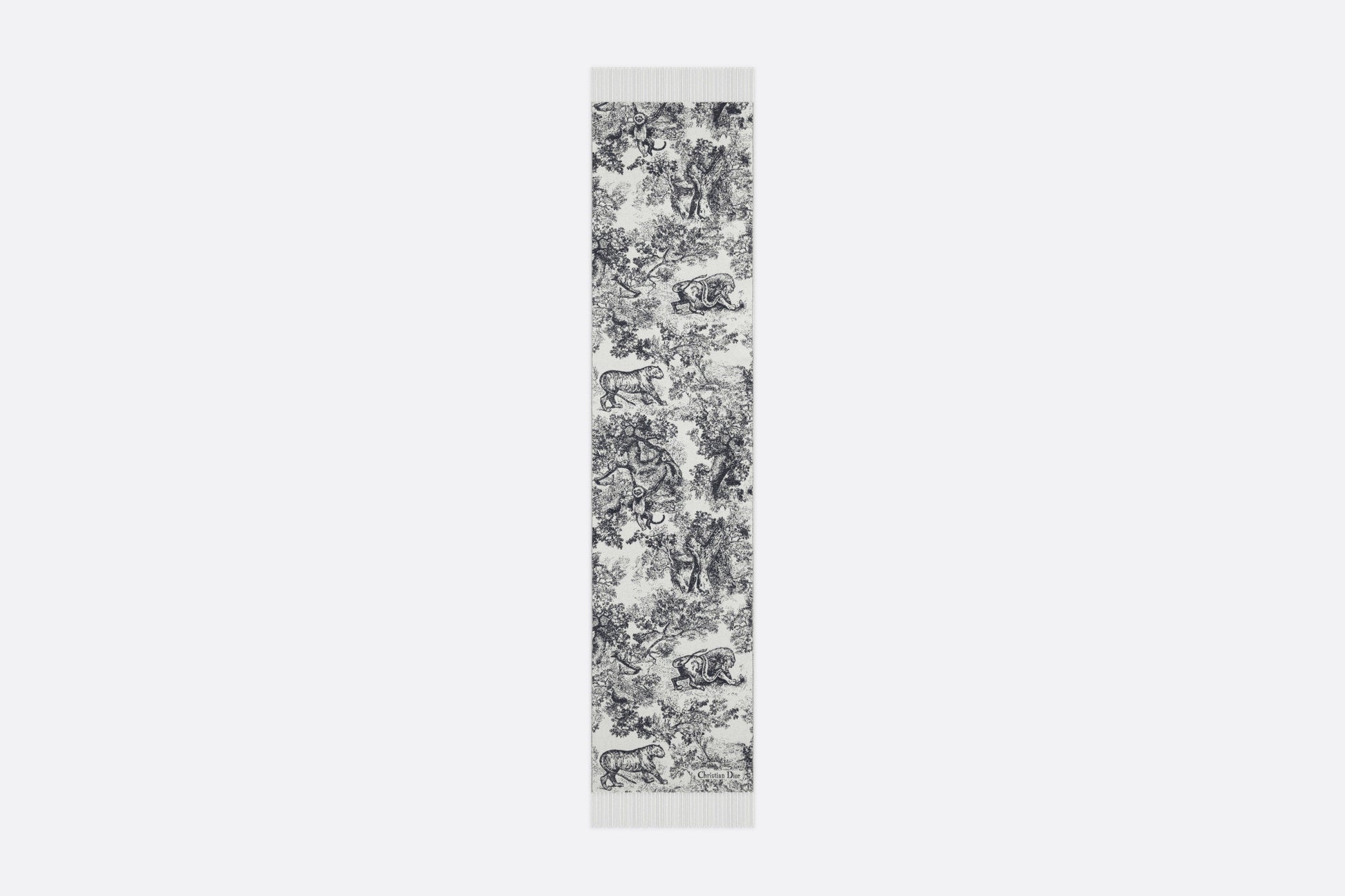 The navy blue Toile de Jouy Sauvage scarf offers a new take on the hallmark House motif. Crafted in a blend of cashmere and wool, the style features fringed edging and the Christian Dior signature. Long and enveloping, the scarf can be worn around the neck or draped over the shoulders.