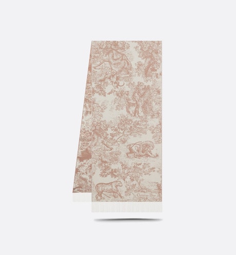 The Rose des Vents Toile de Jouy Sauvage scarf offers a new take on the hallmark House motif. Crafted in a blend of cashmere and wool, the style features fringed edging and the Christian Dior signature. The long and enveloping scarf can be worn around the neck or draped over the shoulders.