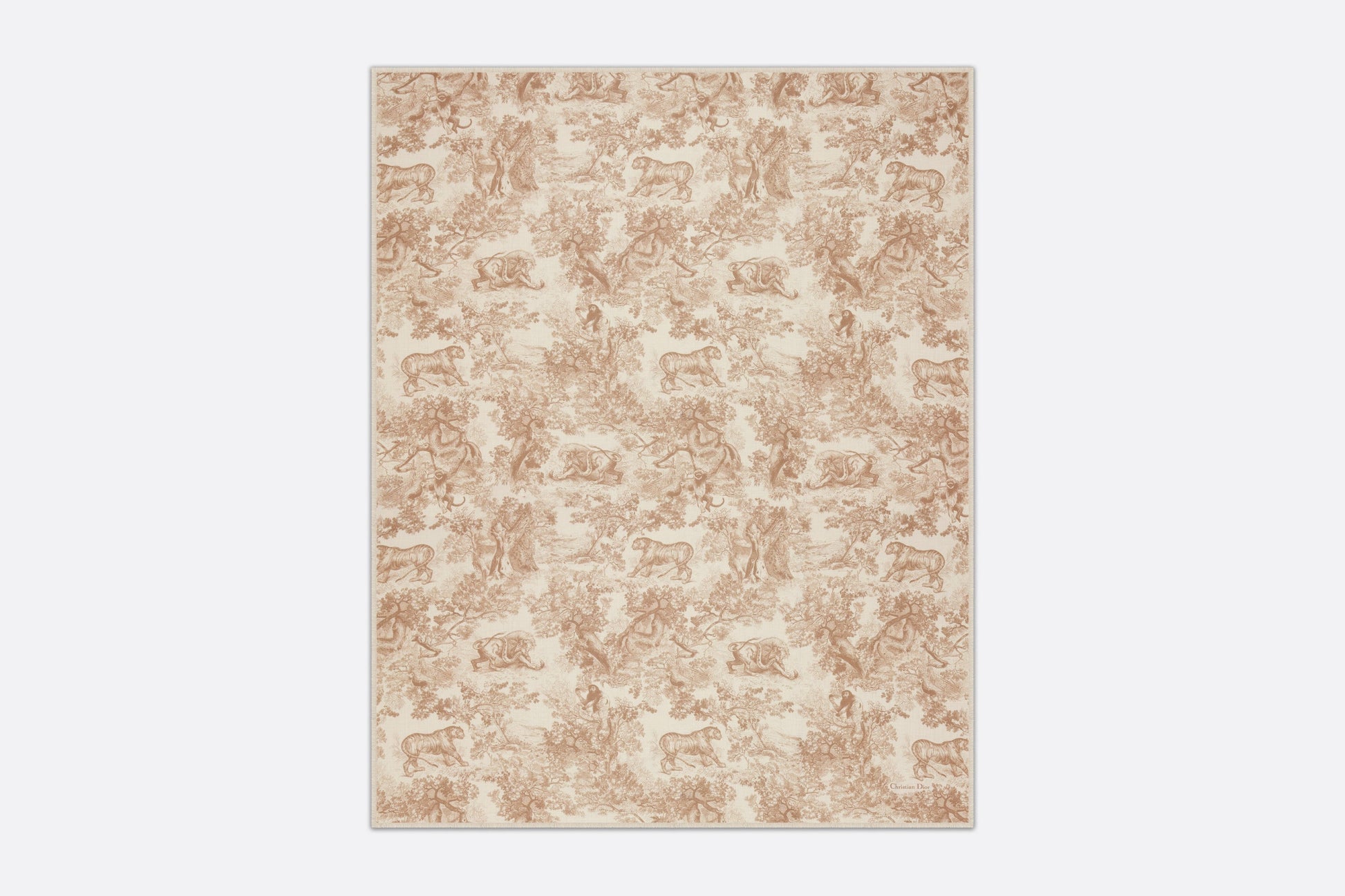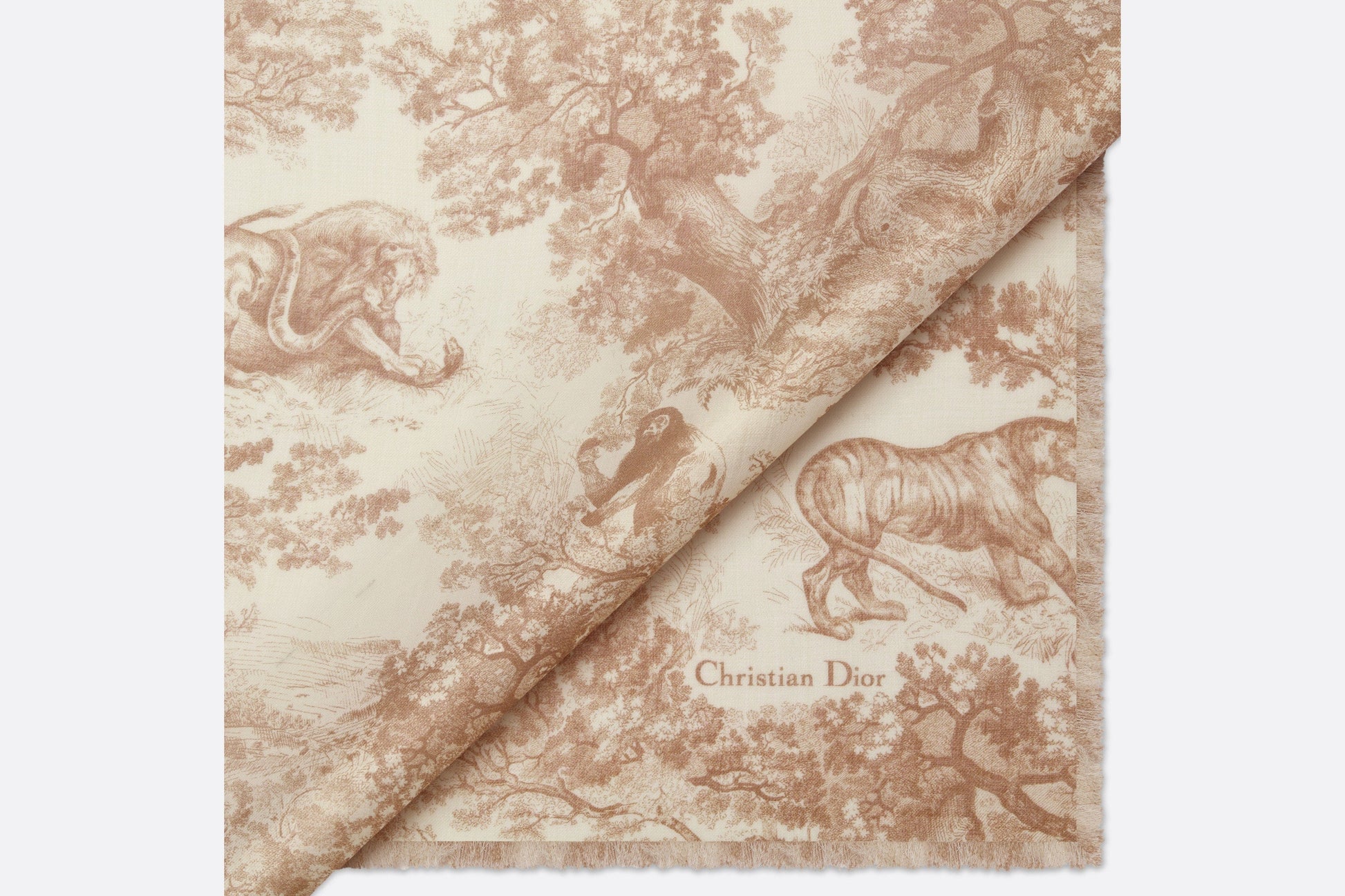 The stole showcases the Toile de Jouy Sauvage motif, a new take on the hallmark House pattern. Crafted in ivory and beige cashmere, the soft style has hand-fringed edges and is embellished with a Christian Dior signature. Soft, refined and enveloping, the large stole can be worn around the neck or draped over the shoulders, and can be worn with other Dior creations.