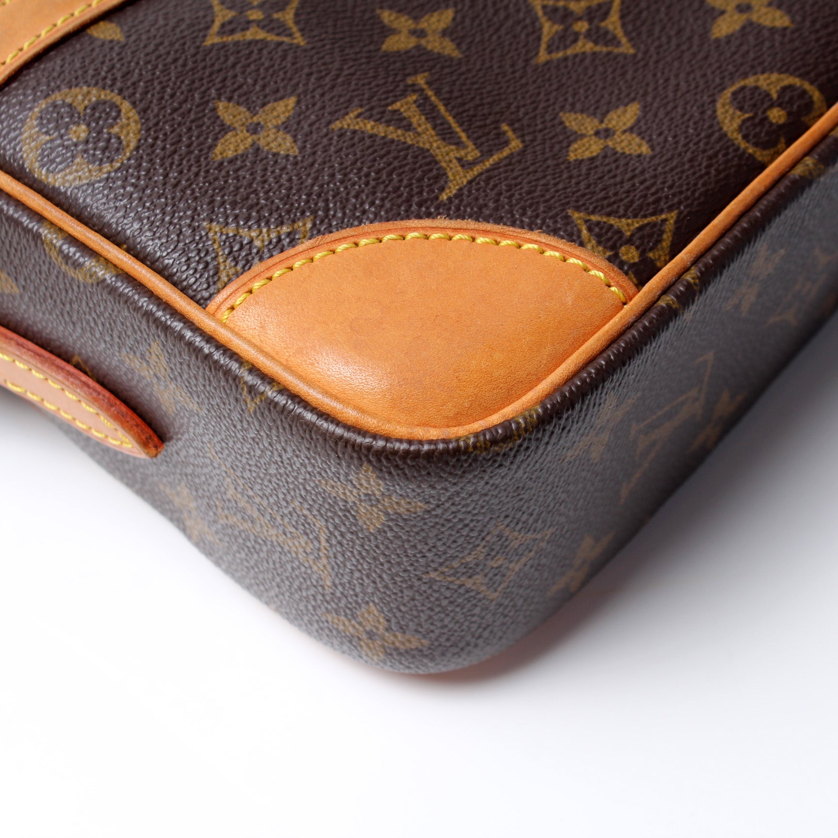 Exterior: The exterior coated canvas is free of any rips or cracks. The corners and leather details show discoloration and wear.