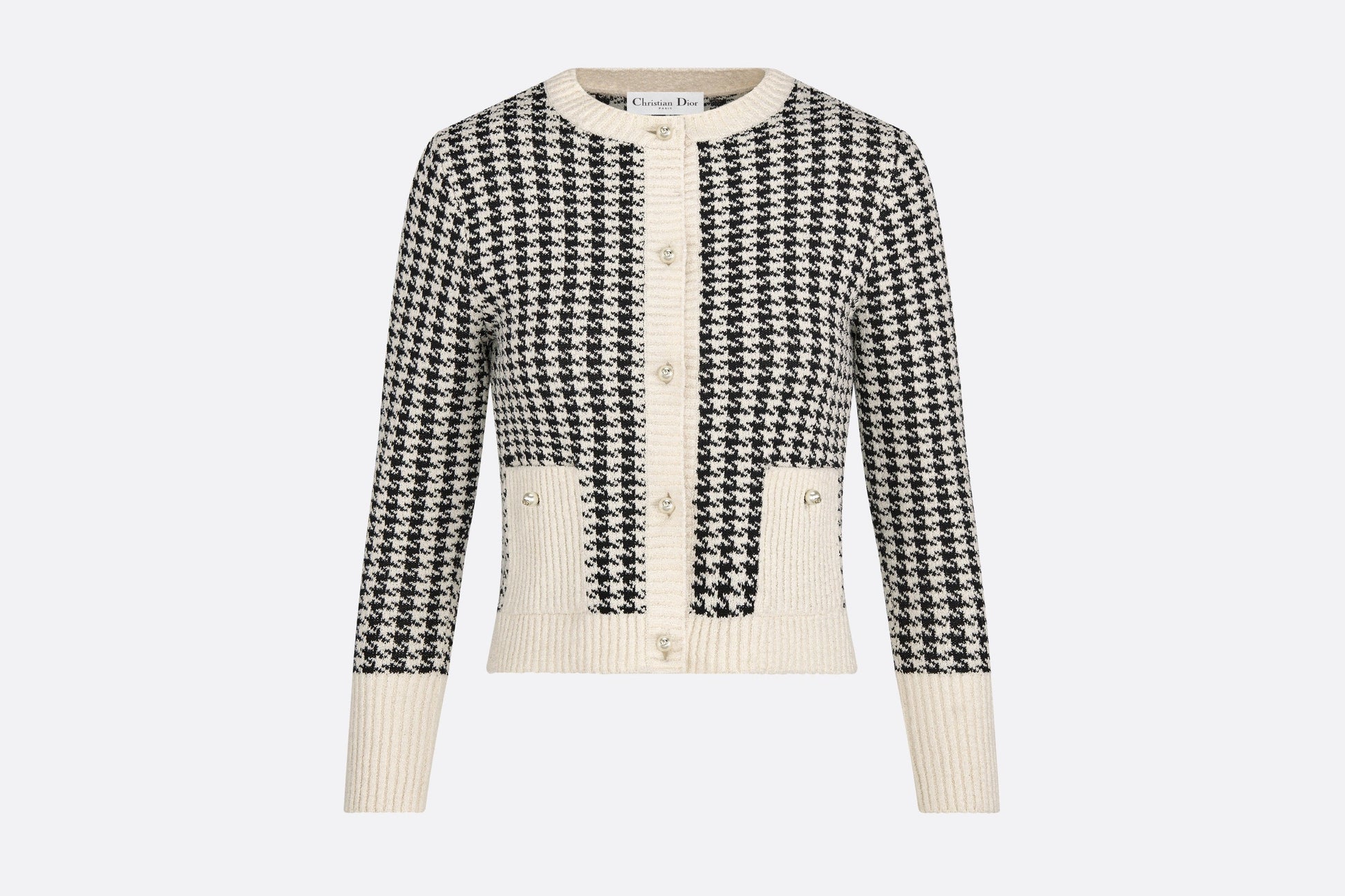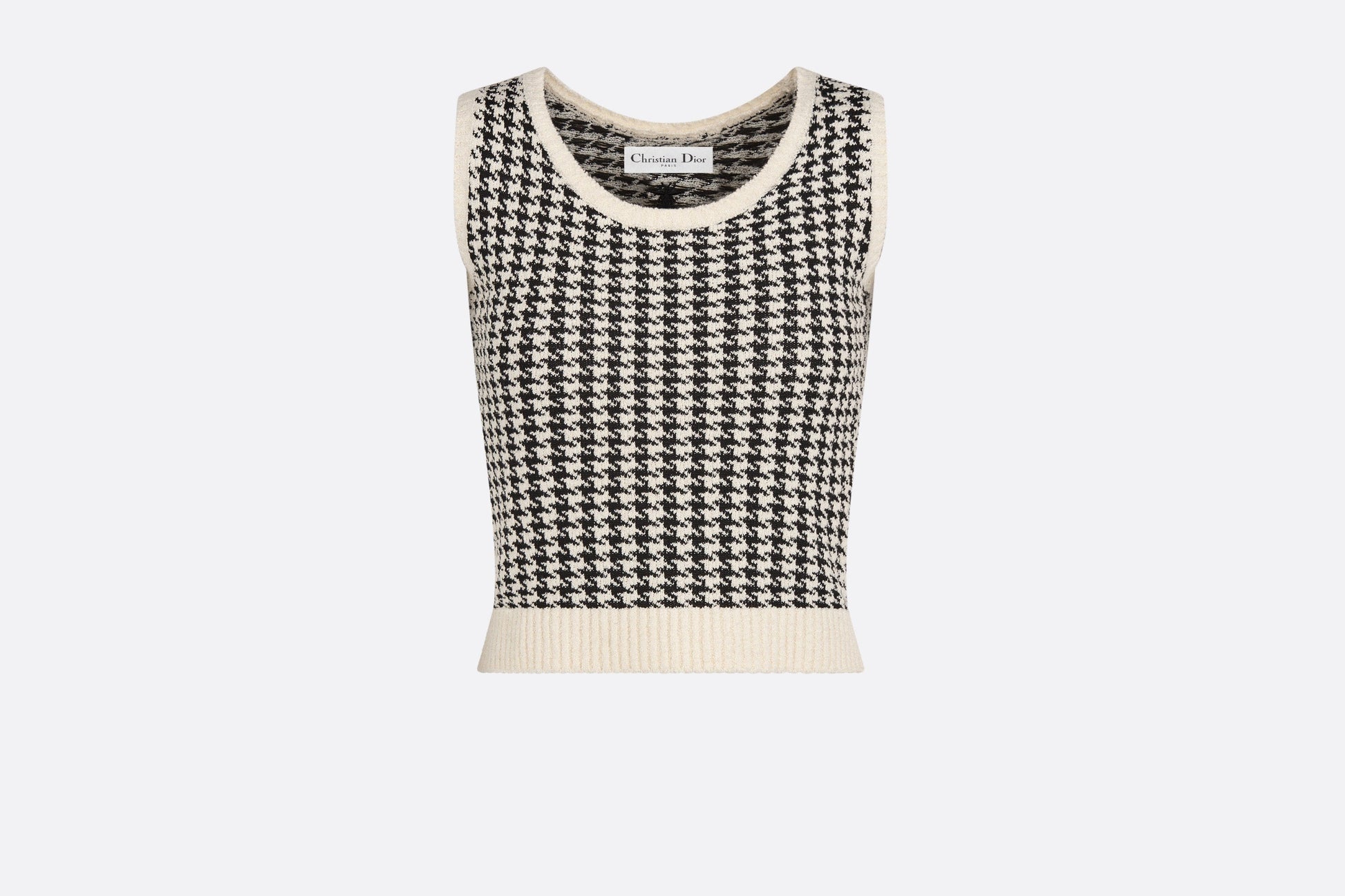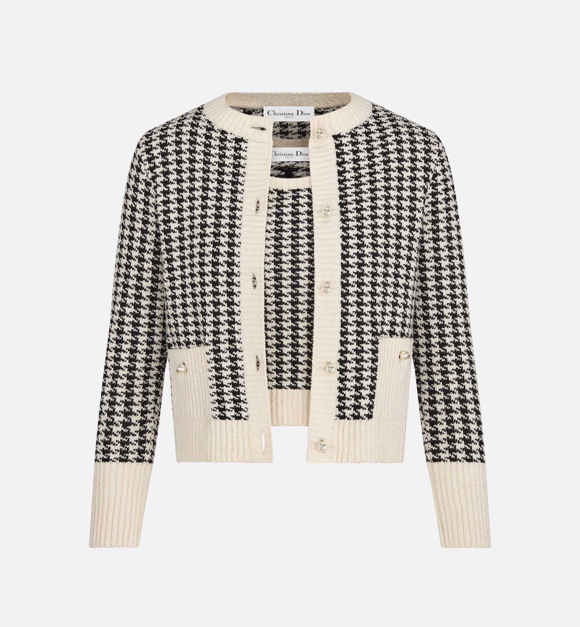 The twin-set showcases the hallmark Houndstooth motif. Crafted in black and white technical cotton knit, it is composed of a round-neck tank top, as well as a cardigan with Dior Tribales buttons featuring a resin pearl and CD signature, inspired by the iconic House earring. The twin-set will complete a pencil skirt from the collection for an iconic look.