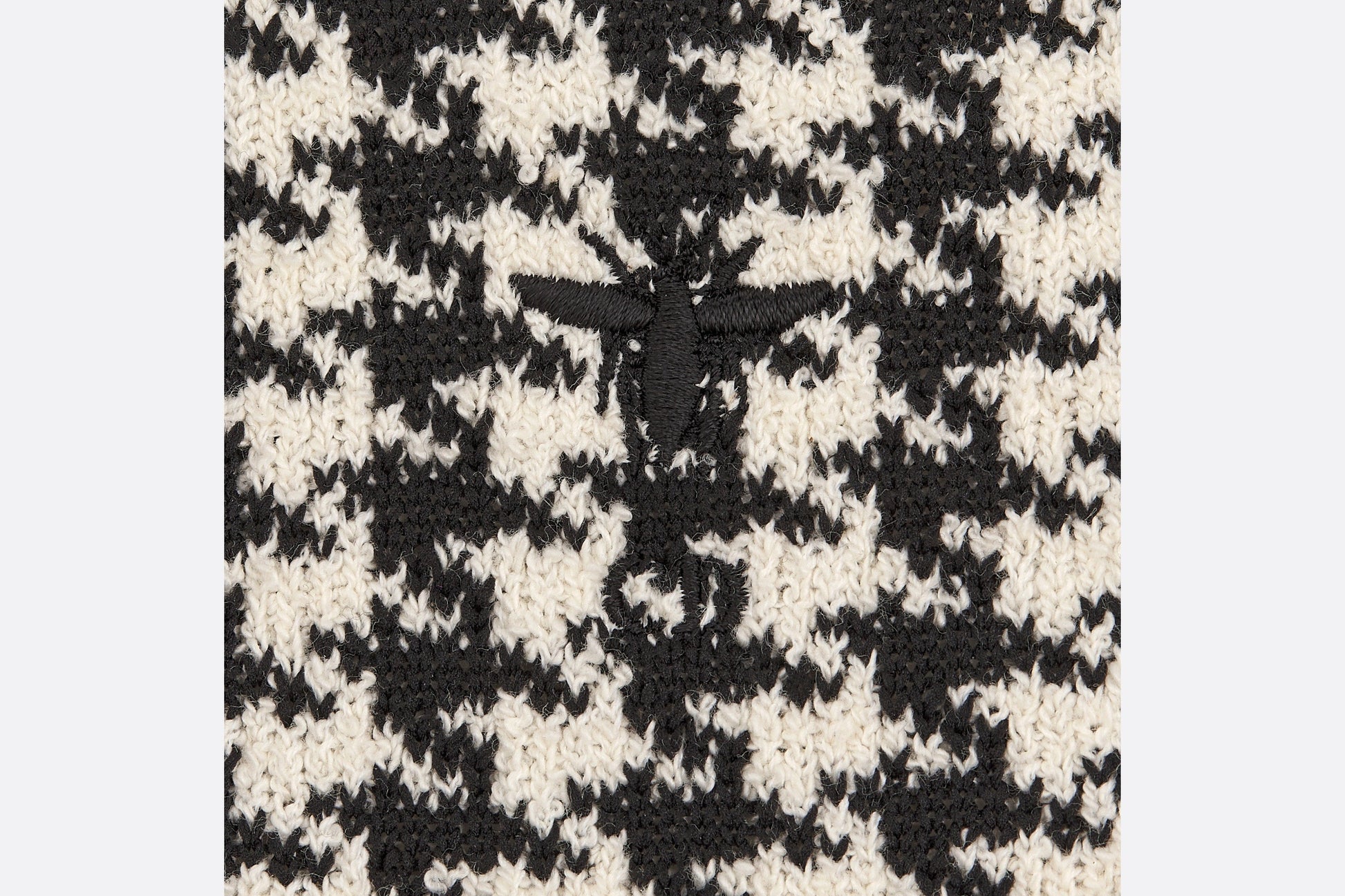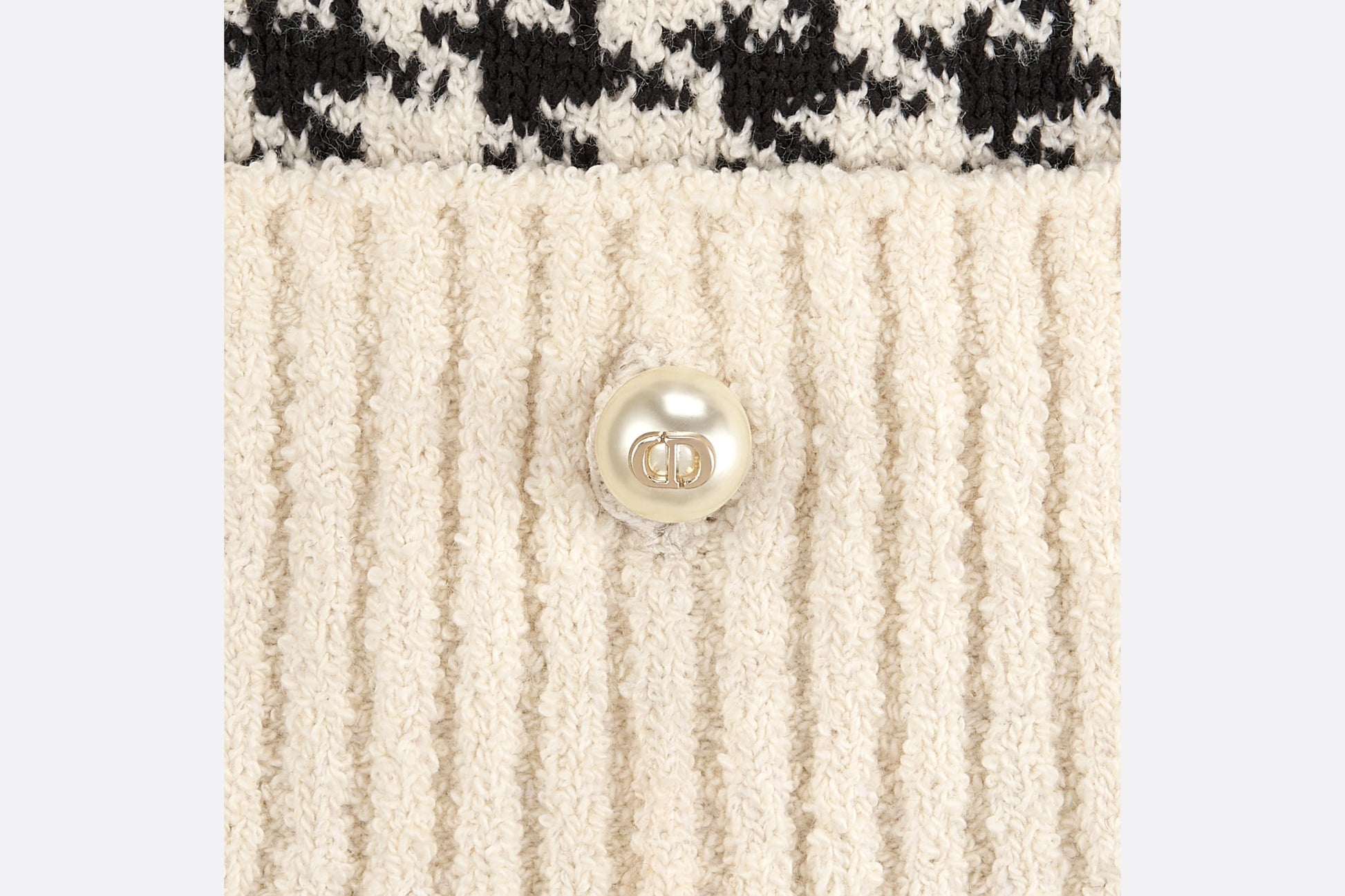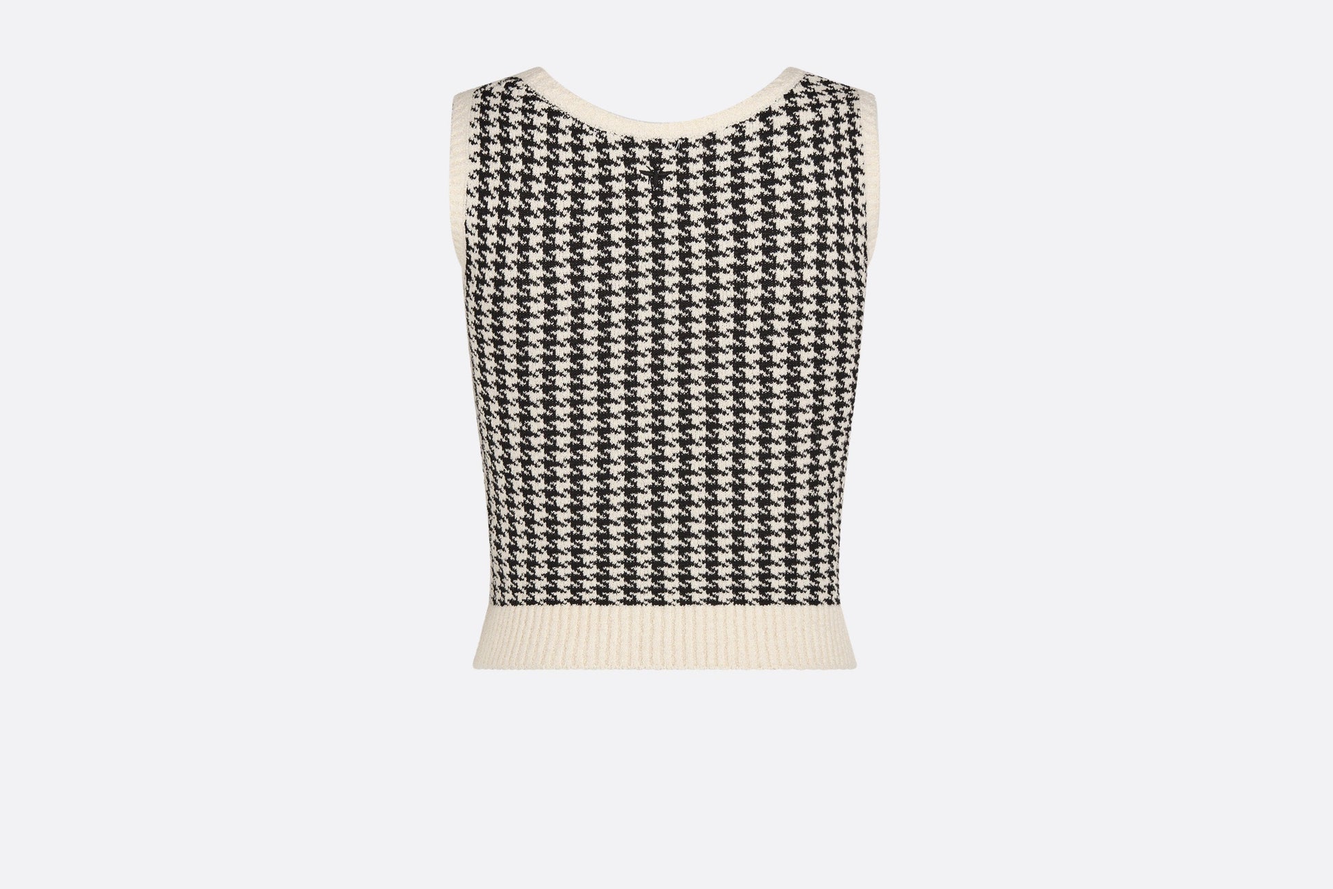 The twin-set showcases the hallmark Houndstooth motif. Crafted in black and white technical cotton knit, it is composed of a round-neck tank top, as well as a cardigan with Dior Tribales buttons featuring a resin pearl and CD signature, inspired by the iconic House earring. The twin-set will complete a pencil skirt from the collection for an iconic look.