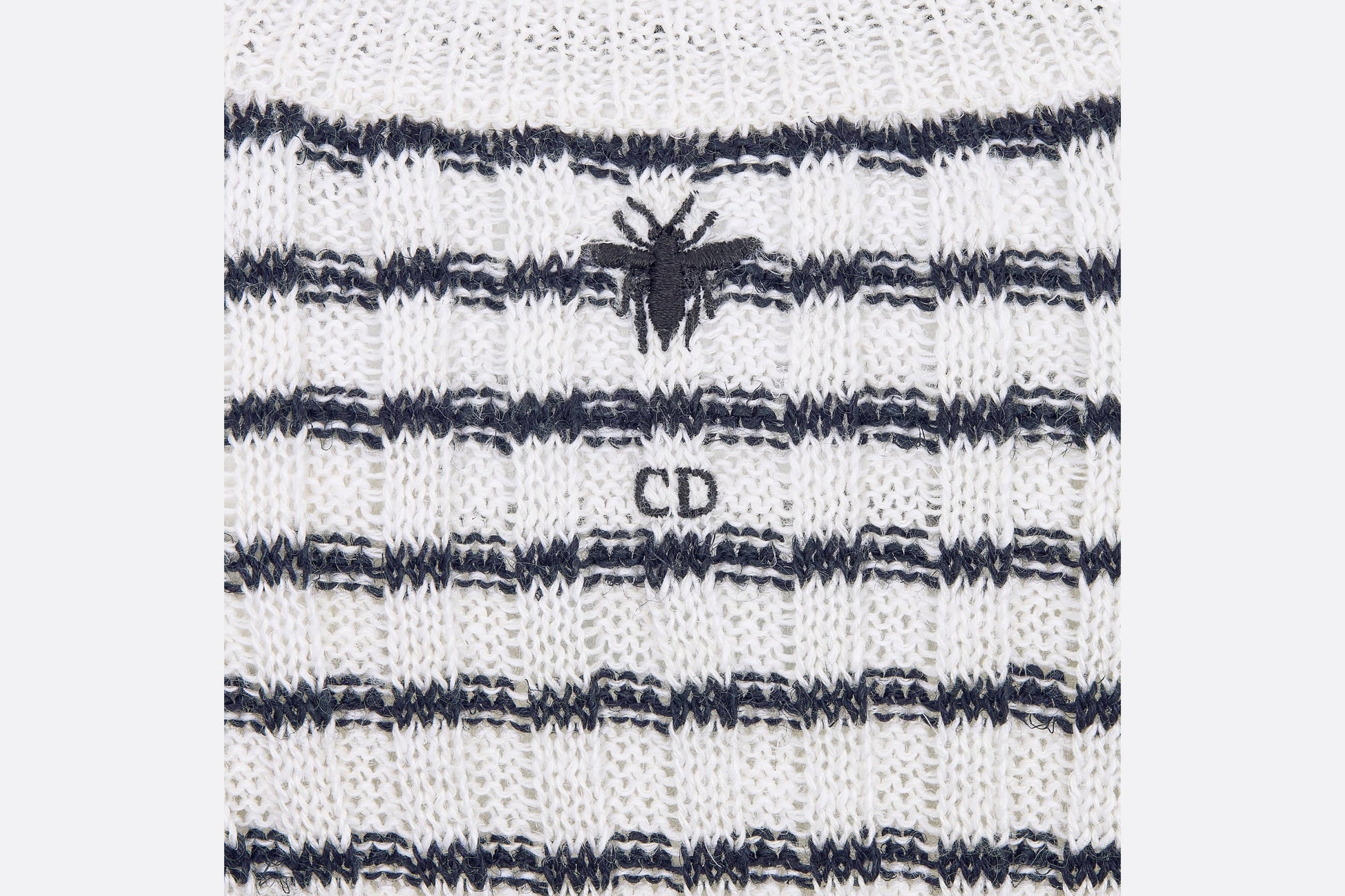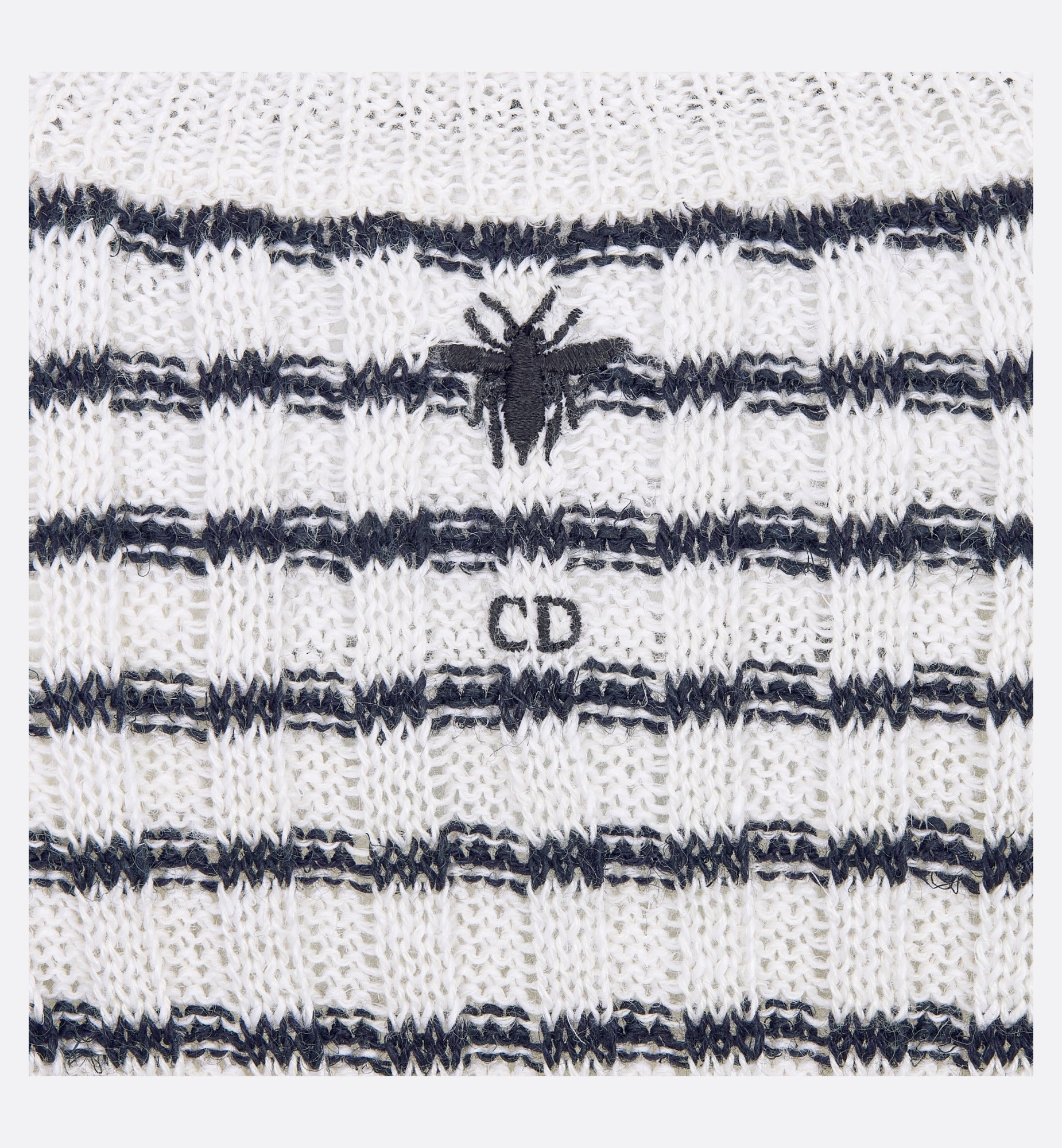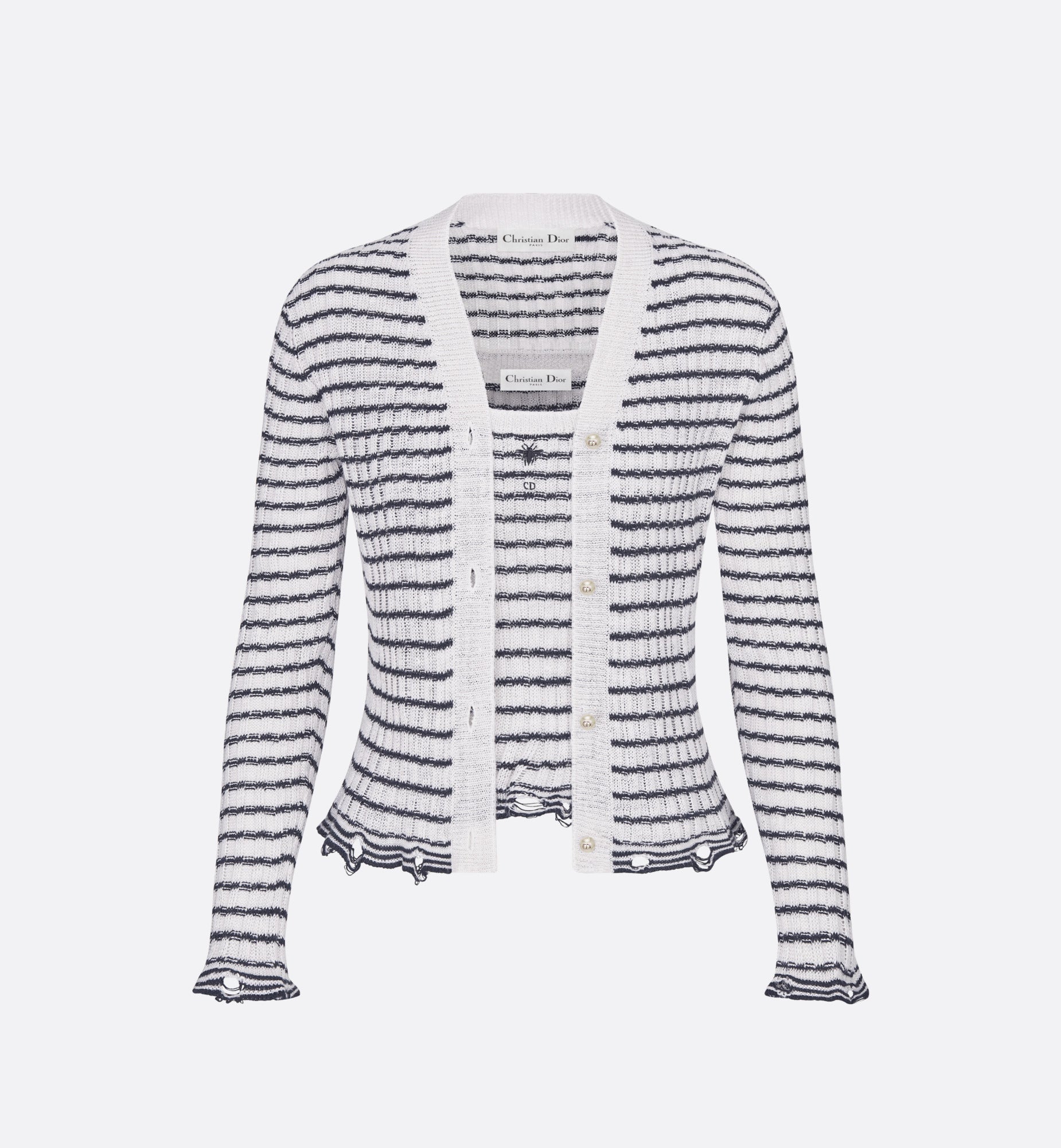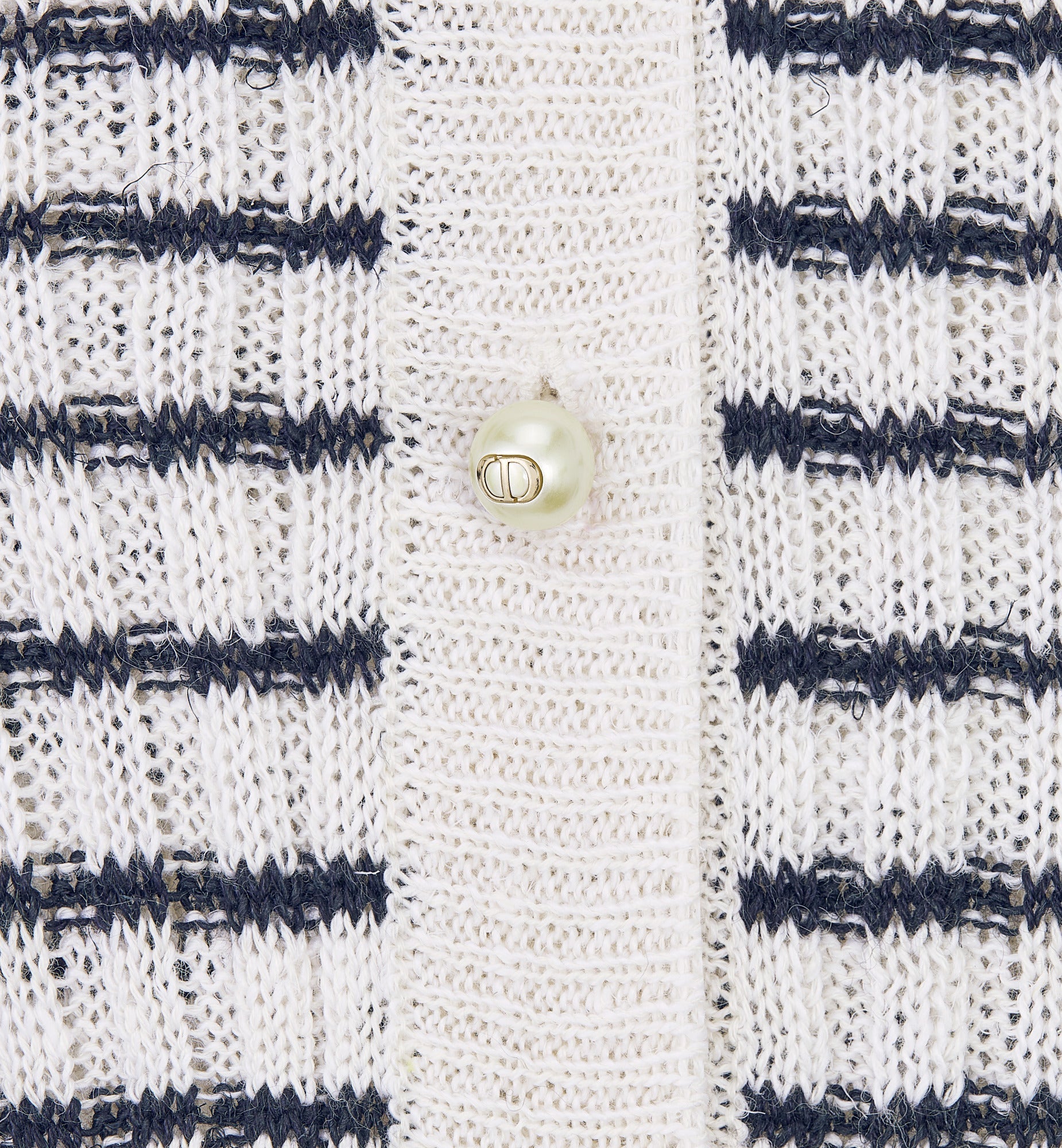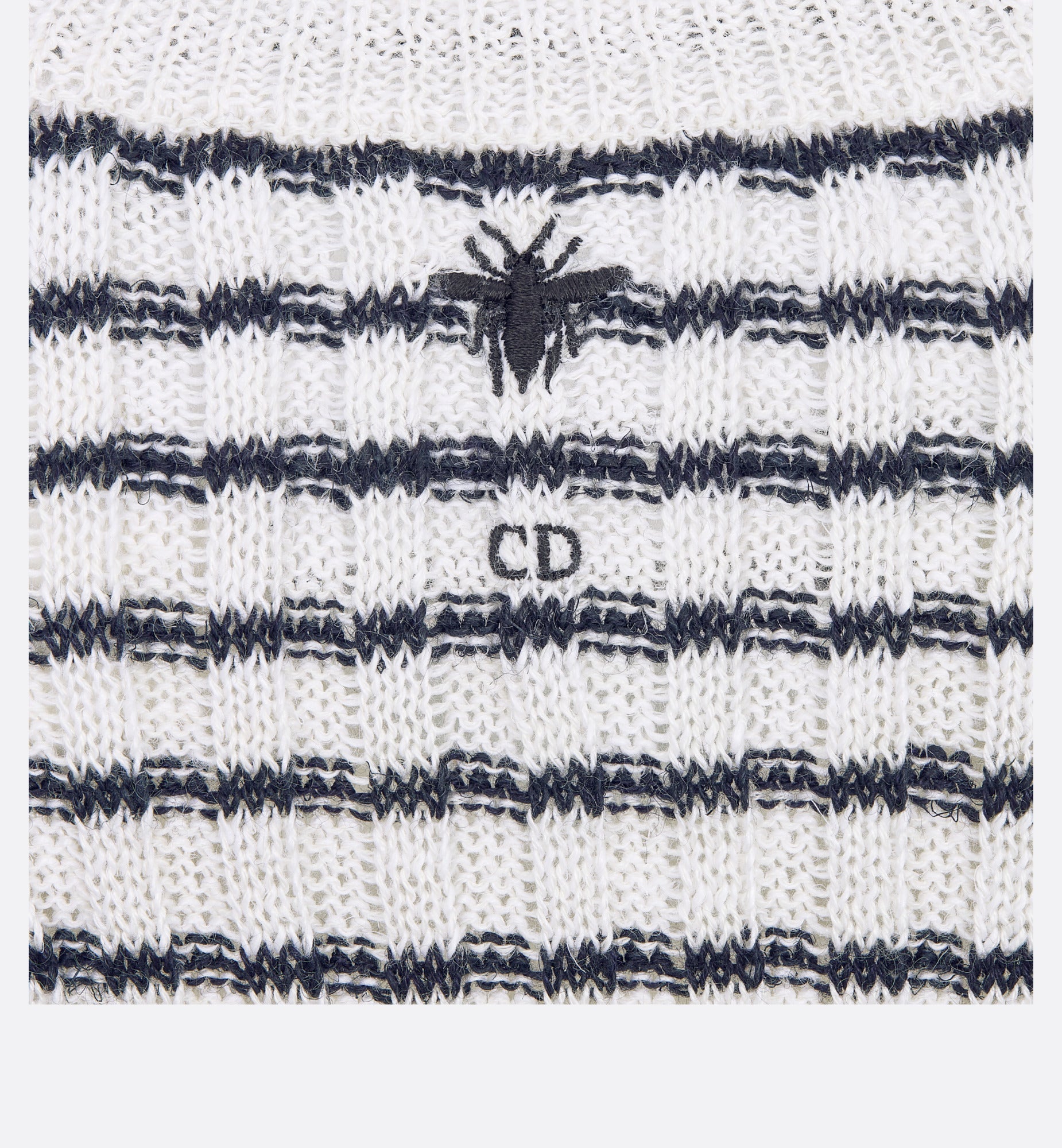 New for the Cruise 2024 collection, the twin-set is a timeless creation reframed with a modern twist. Crafted in white and black linen, cashmere and silk knit, it is composed of a tank top embroidered with a hallmark bee as well as a cardigan with Dior Tribales buttons, showcasing a CD resin pearl inspired by the House's iconic earring. Featuring a hem and cuffs with a distressed effect, the twin-set will complete a skirt from the collection for an emblematic look.