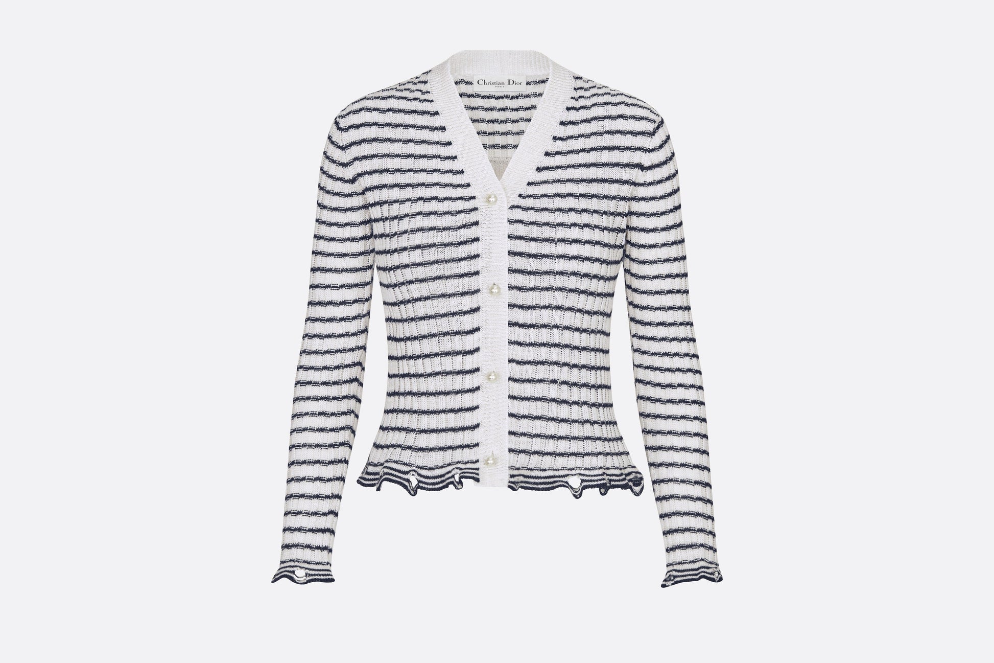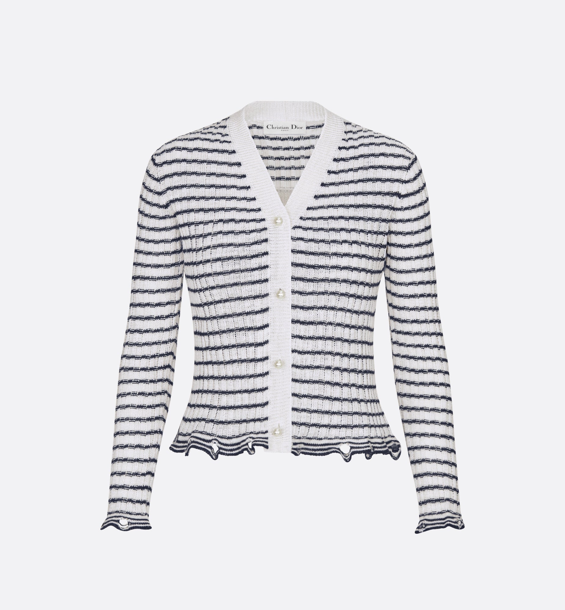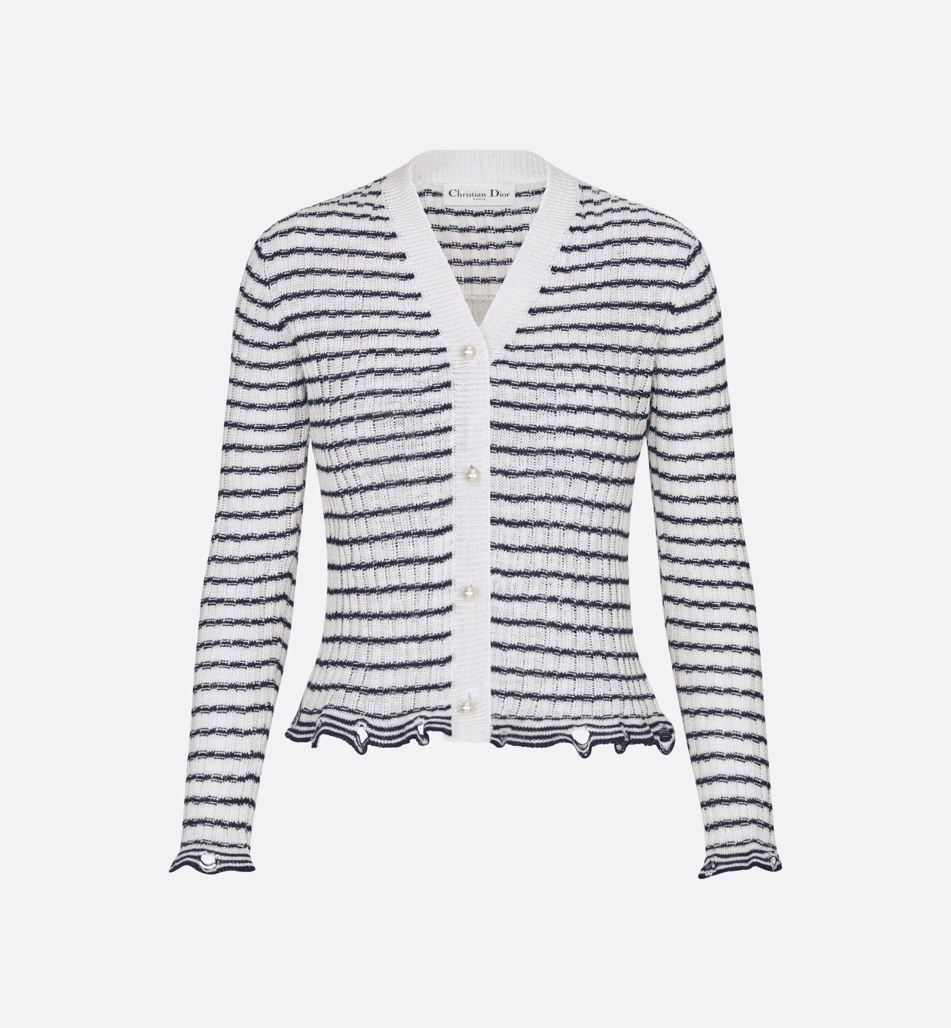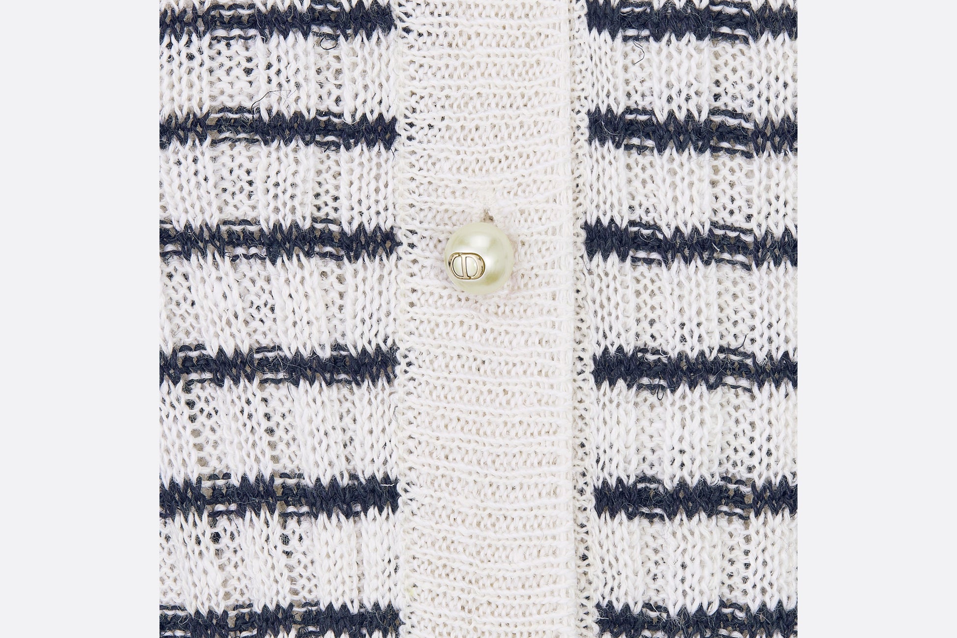New for the Cruise 2024 collection, the twin-set is a timeless creation reframed with a modern twist. Crafted in white and black linen, cashmere and silk knit, it is composed of a tank top embroidered with a hallmark bee as well as a cardigan with Dior Tribales buttons, showcasing a CD resin pearl inspired by the House's iconic earring. Featuring a hem and cuffs with a distressed effect, the twin-set will complete a skirt from the collection for an emblematic look.