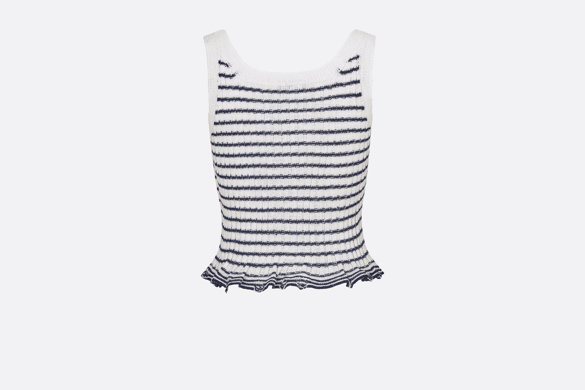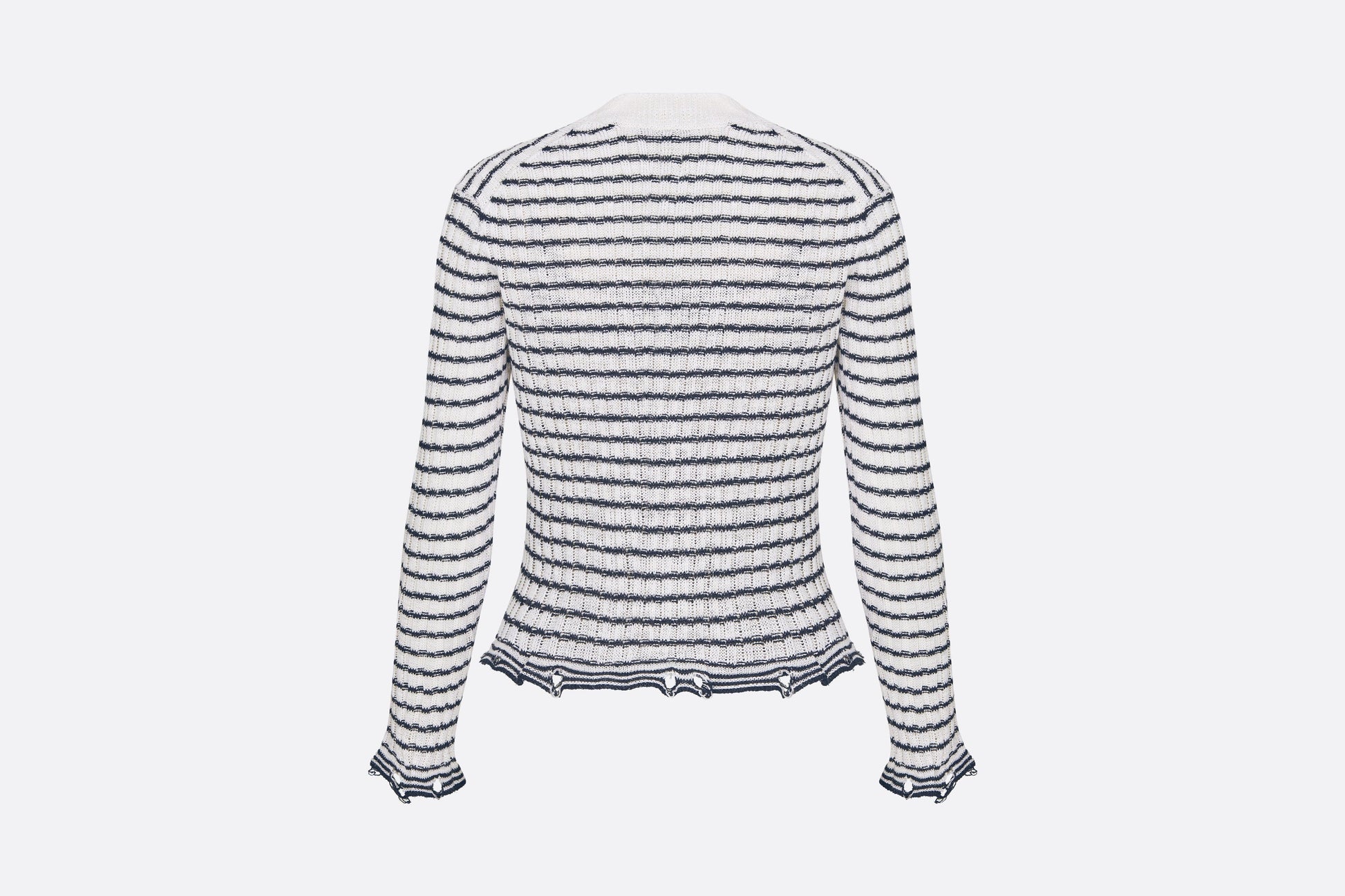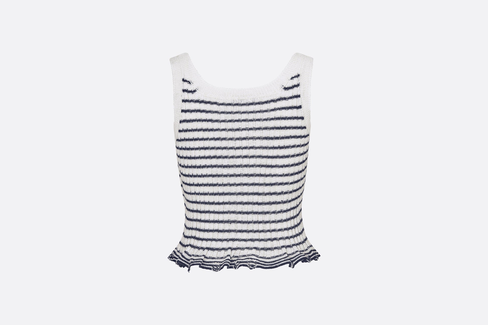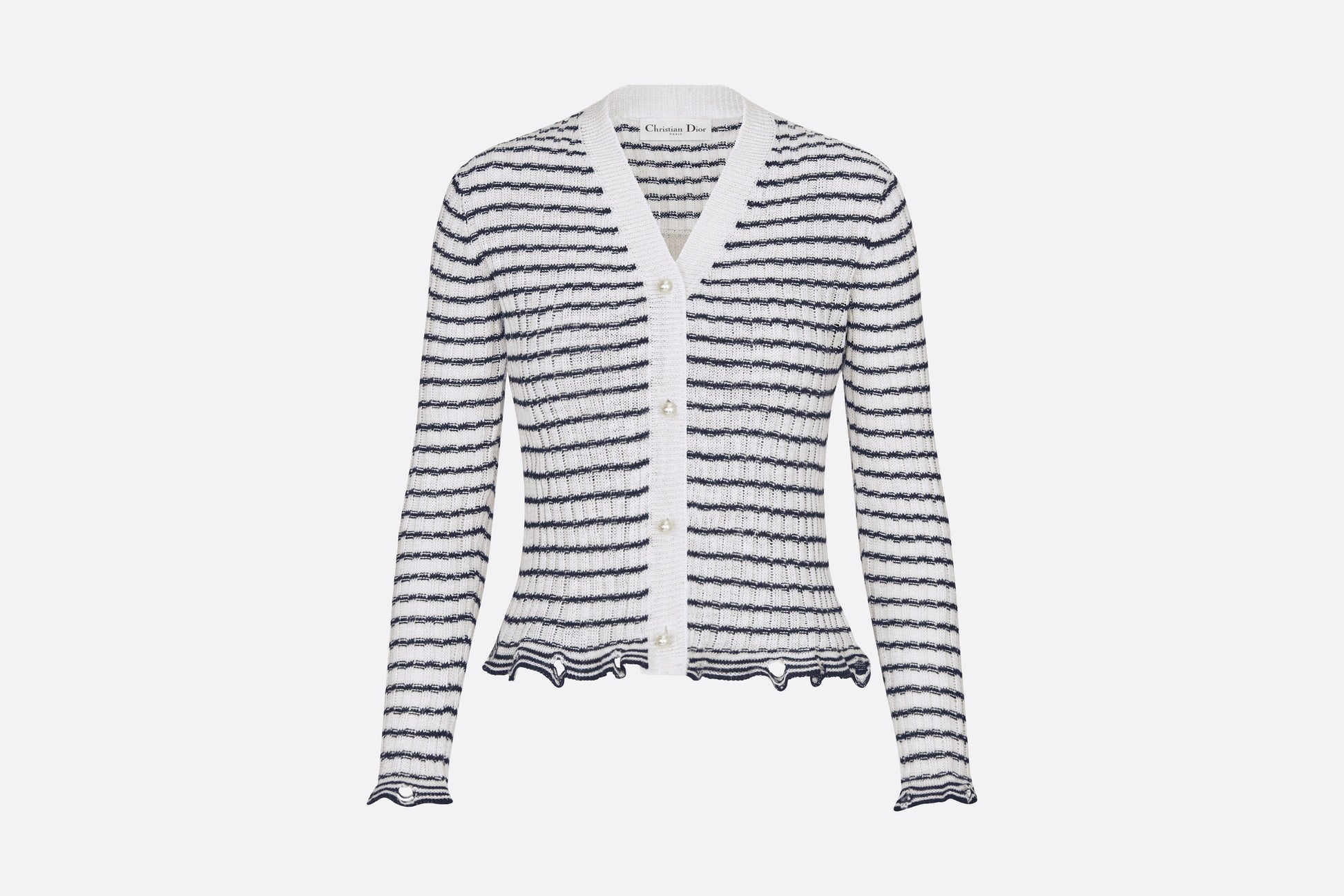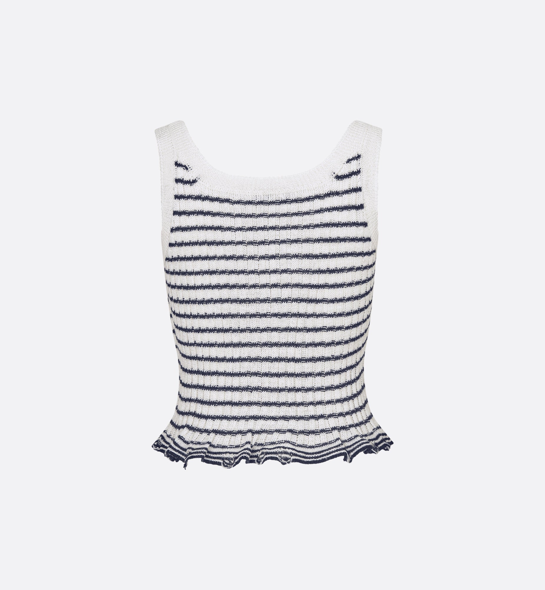 New for the Cruise 2024 collection, the twin-set is a timeless creation reframed with a modern twist. Crafted in white and black linen, cashmere and silk knit, it is composed of a tank top embroidered with a hallmark bee as well as a cardigan with Dior Tribales buttons, showcasing a CD resin pearl inspired by the House's iconic earring. Featuring a hem and cuffs with a distressed effect, the twin-set will complete a skirt from the collection for an emblematic look.