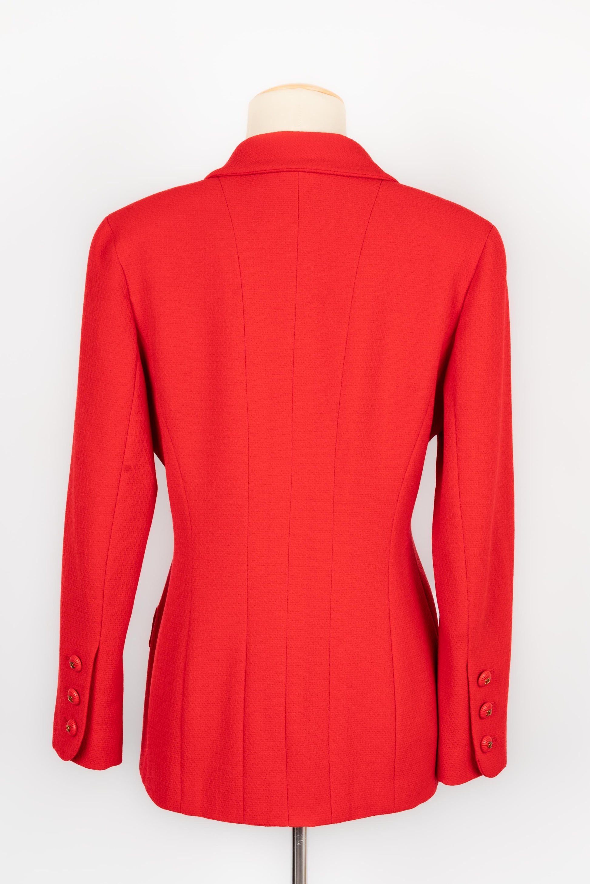 CHANEL - (Made in France) Veste en laine rouge, boutons en résine et métal doré. Doublure en soie. Taille 40FR. Collection Printemps/Eté 1993.