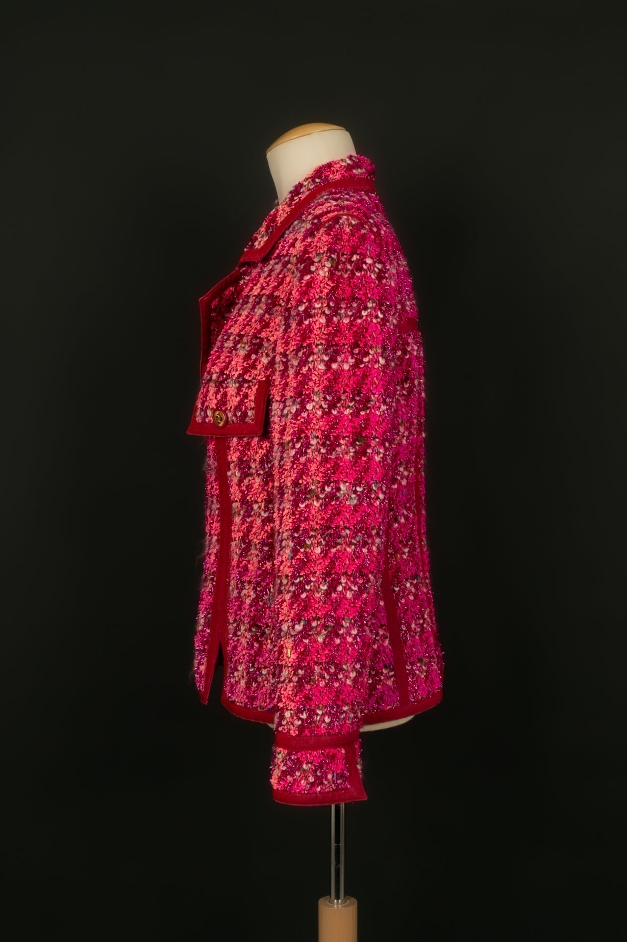 CHANEL - Veste en tweed rose, bordée de galons, boutons en résine et métal doré. Pas de taille indiquée, elle correspond à un 44FR/46FR. Illustration Vogue Italie, Septembre 1991.