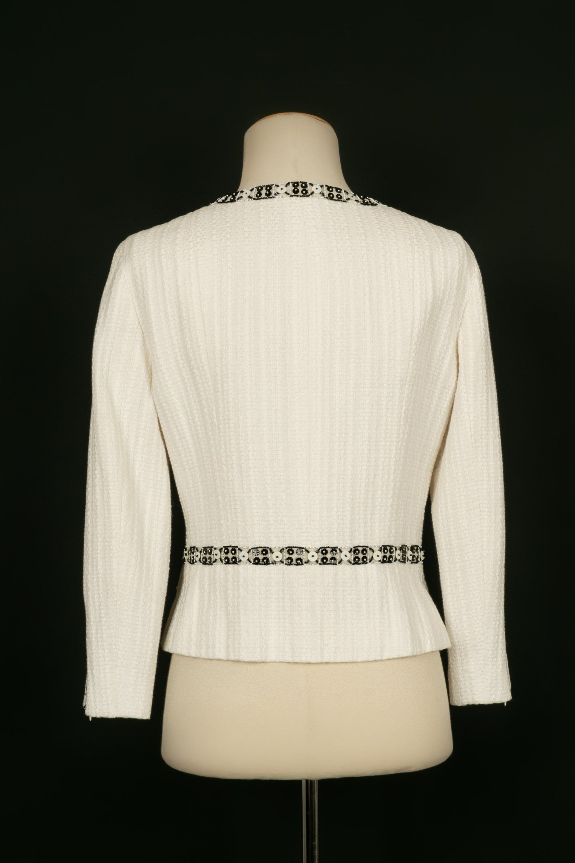 CHANEL -(Made in France) Veste en coton et lin blanc brodée de perles et paillettes. Doublure en soie. Taille 42FR. Collection Printemps/Eté 2003. A signaler, présence de taches sous les aisselles.