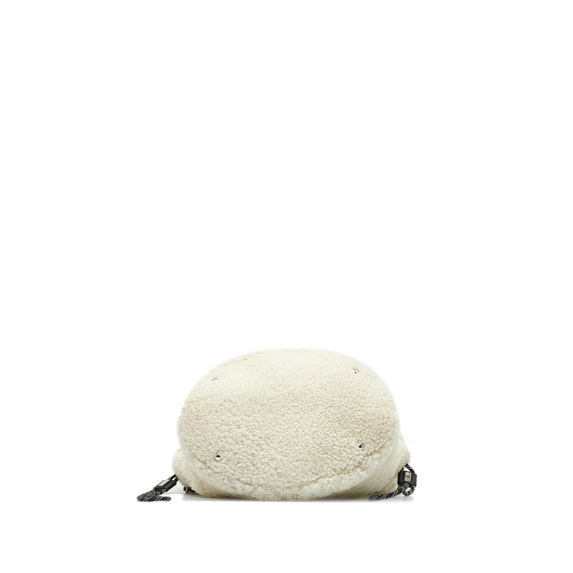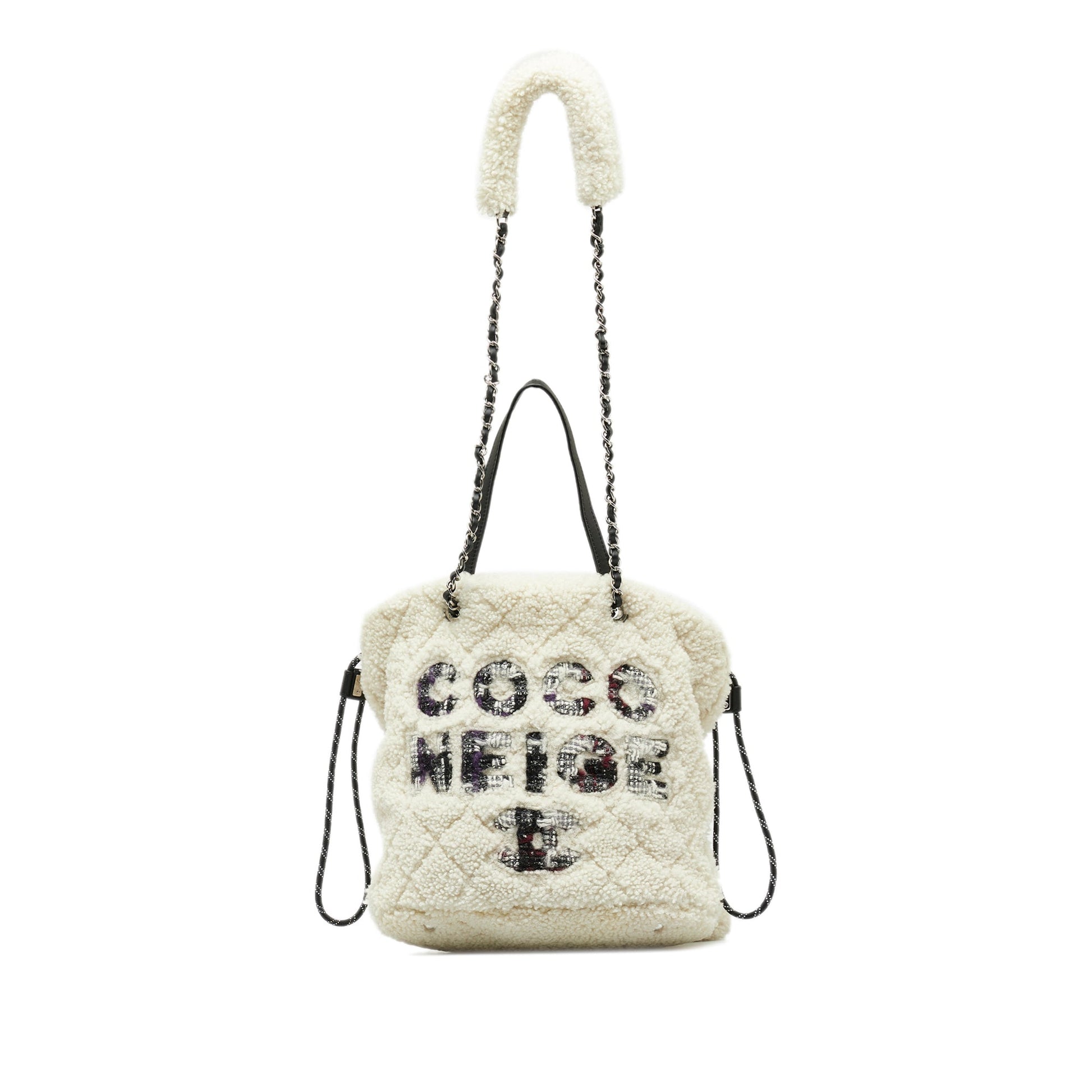 Product Details: White Chanel Shearling Coco Neige Tote Satchel. This satchel features a shearling wool body, leather-woven chain straps, flat leather handles, an open top with drawstring details and magnetic snap closure, and interior slip pockets. 9.8" L x 12.6" W x 7.5" D, 5.1" drop. Serial number 28620176.