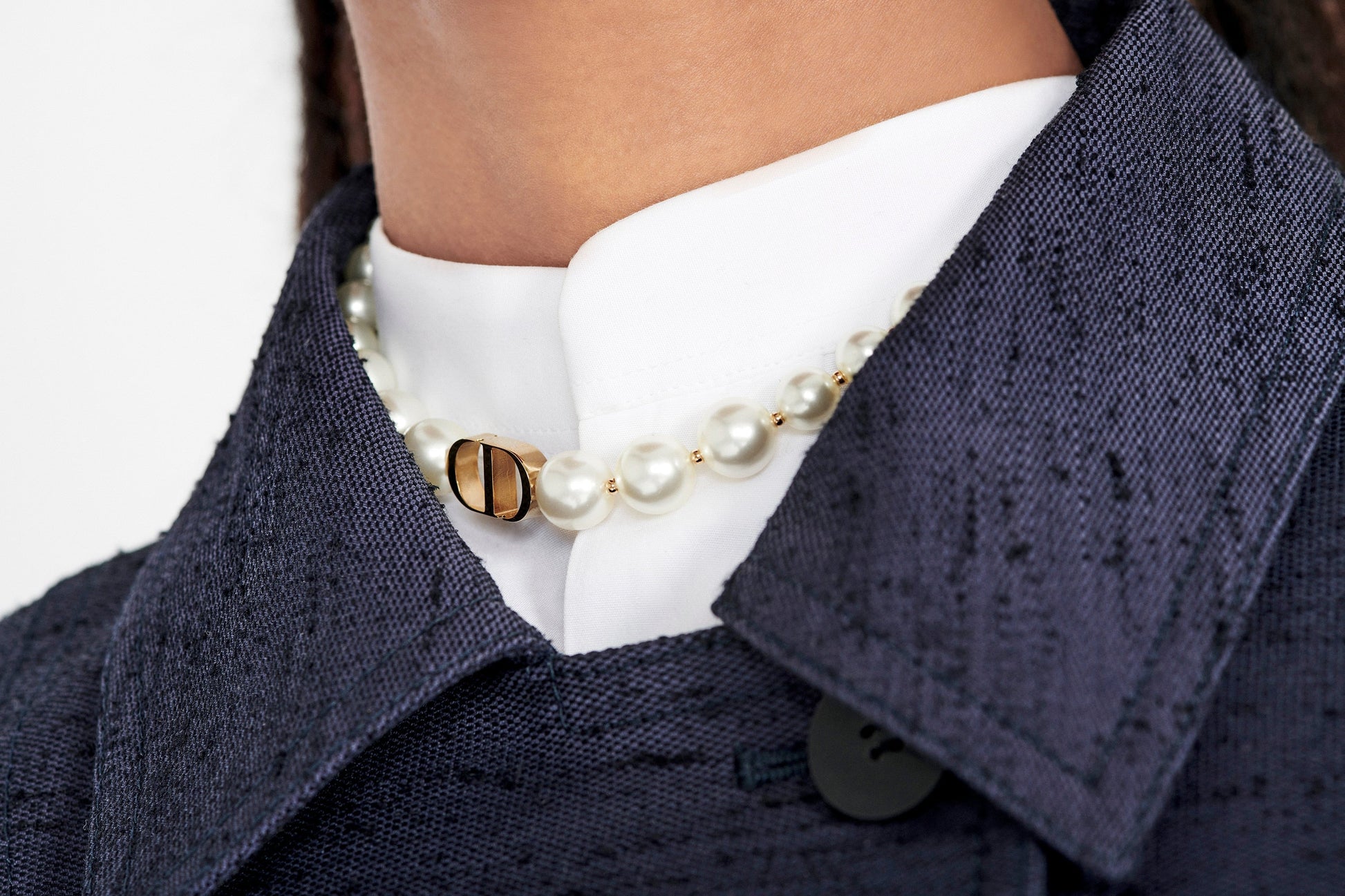 The 30 Montaigne choker features a strand of white resin pearls that increase in size toward the center of the design. Gold-finish metal separates the resin pearls, creating an elegant contrast, while the 'CD' signature at the center ties in a classic feature of the collection. Pairing this design with other pearl-look pieces can create a range of coordinated looks.